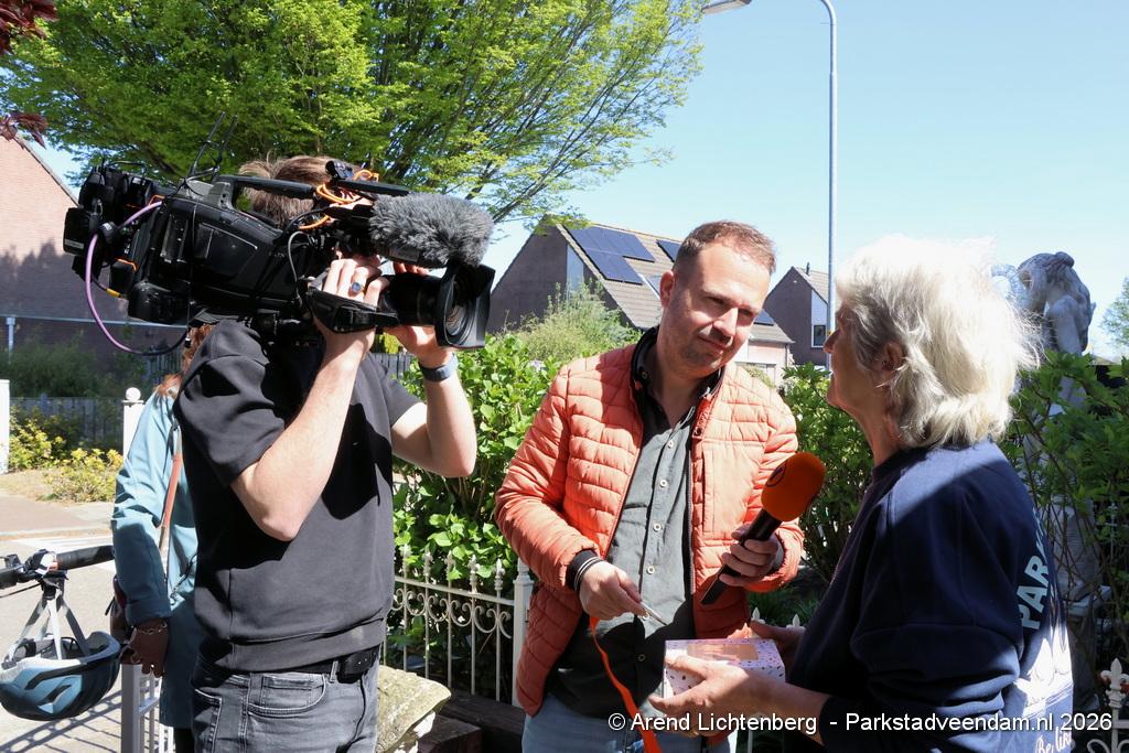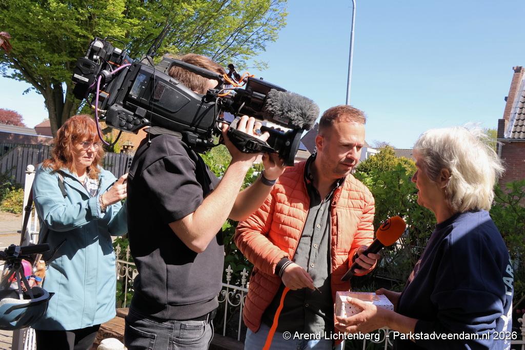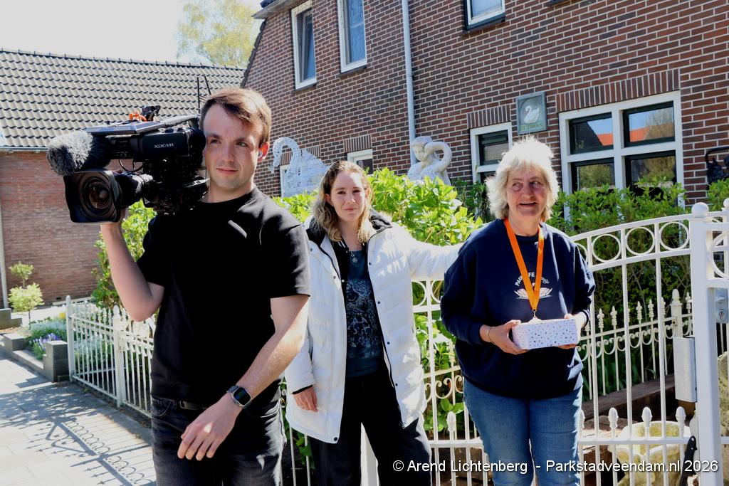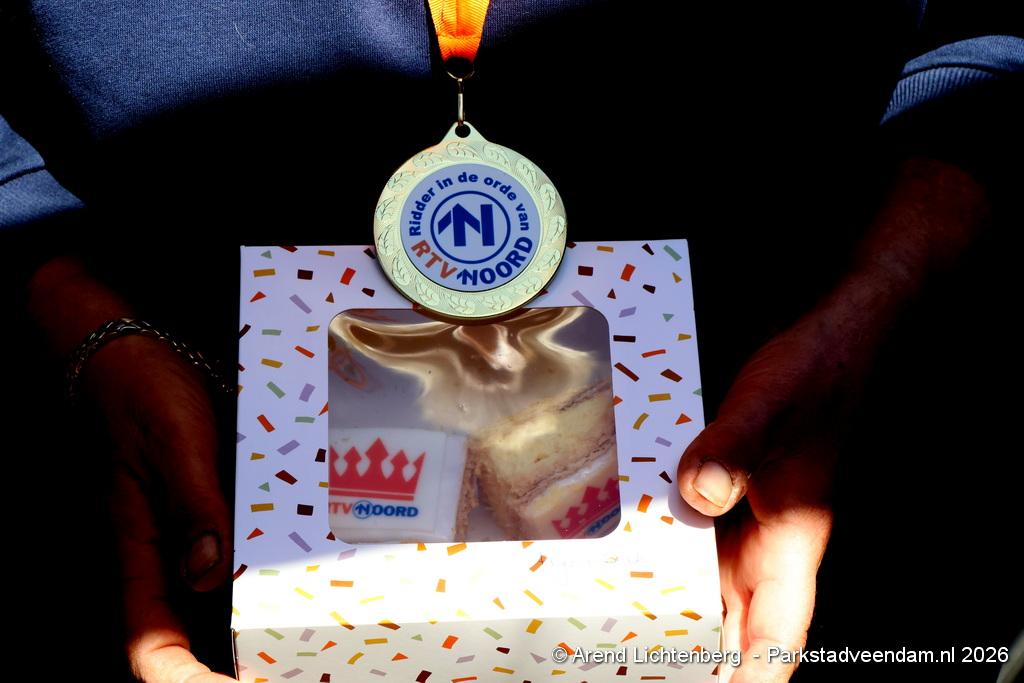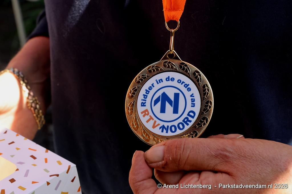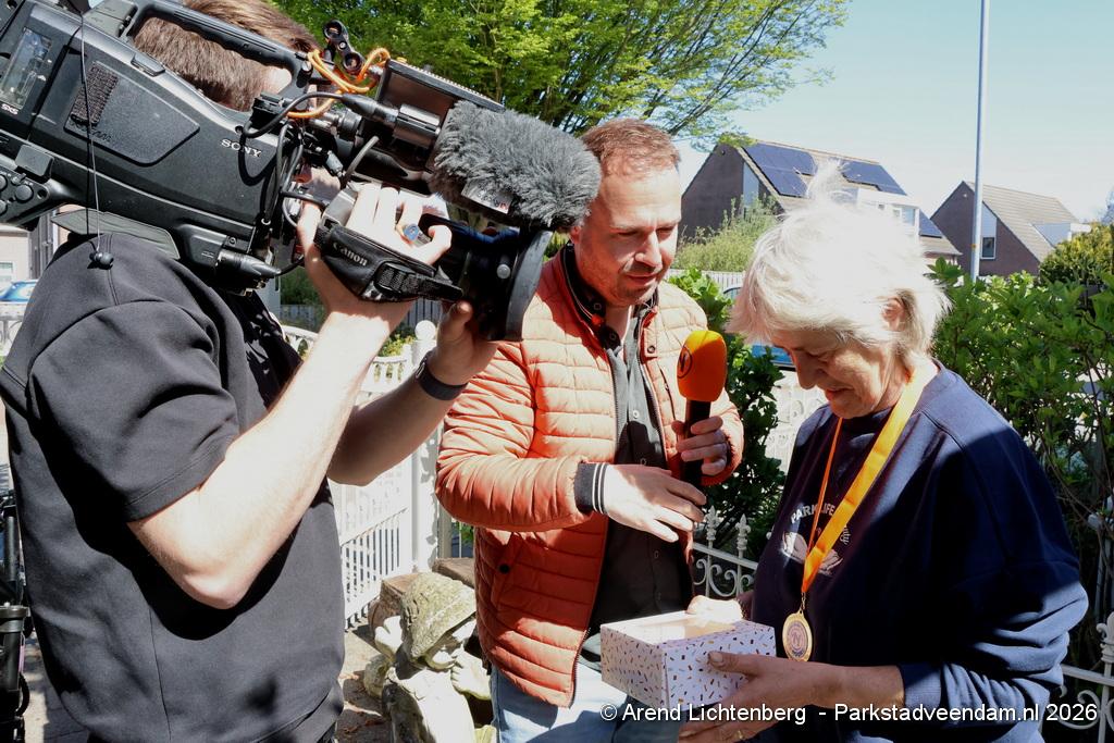 Verslaggever Elwin Baas van RTV Noord overhandigde haar het lintje. Trijnie reageerde zichtbaar ontroerd. ‘Geweldig. Ik vind het echt mooi.’