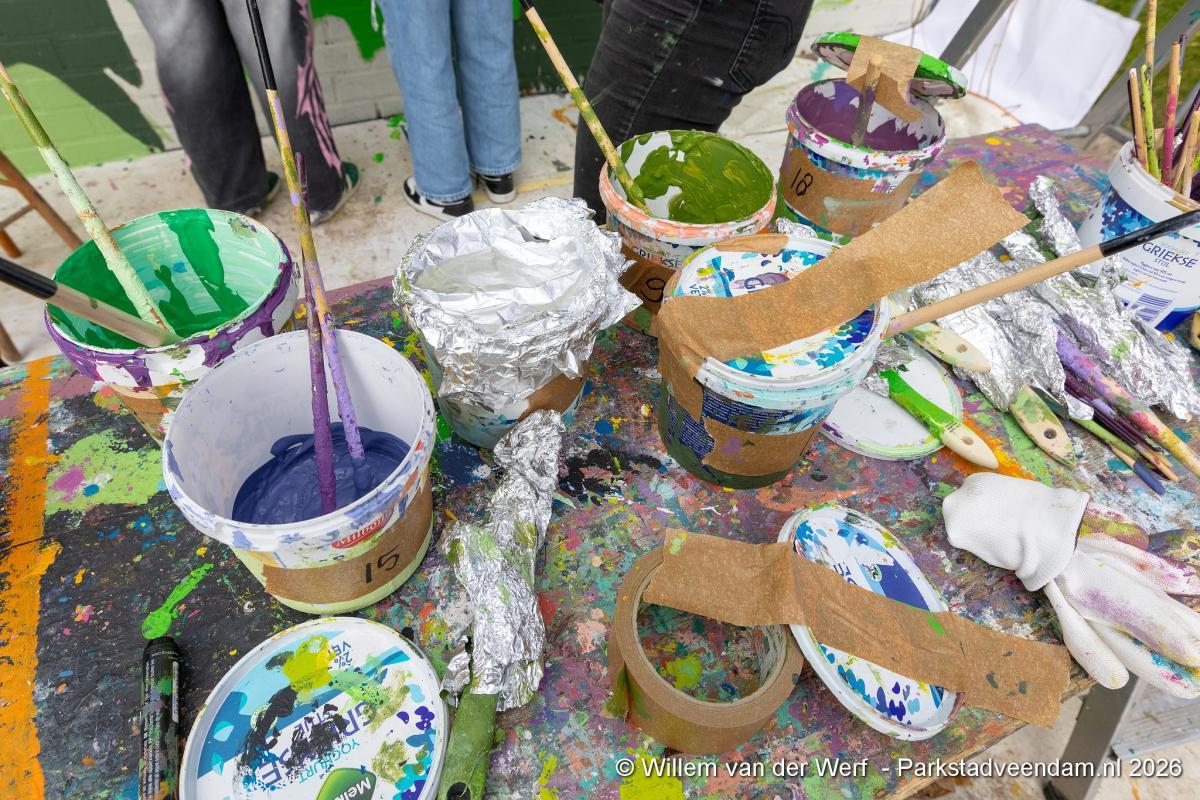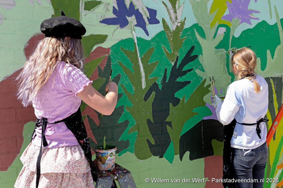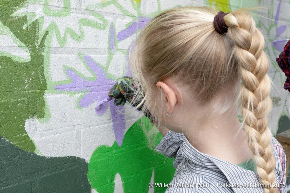 Donderdag zette de kunstenares de eerste lijnen uit en schilderde zij de bovenkant van de muur. Vrijdagochtend begonnen de jongste kinderen met het inkleuren van de vlakken; later op de dag volgden de hogere groepen. Om te zorgen dat iedereen de juiste kleuren gebruikte, waren de verfpotten voorzien van nummers die overeenkwamen met de kleurvakken op de muur.