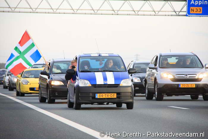 Het waren de colonnes van de opstandige Groningers. Hoewel er via de site van Bram Reinders ook Friezen en Drenten, en zelfs mensen uit Overijssel en Brabant, hadden aangemeld. Onderweg was er veel aanmoediging uit het publiek. Ze stonden op viaducten boven de A7, en de duimen gingen op. Vanuit verkeer in tegengestelde richting werd regelmatig geclaxonneerd. De A7 raakte op een gegeven moment verstopt. Het wachten was op de grote groep vanuit Groningen. Naar verluid was er nabij Zuidbroek een verkeerde afslag genomen. Auto's vanuit ander verkeer was door de politie tussengevoegd, en zo kon het gebeuren dat er wagens van buiten de groep werd gevolgd, waardoor er chaos ontstond.