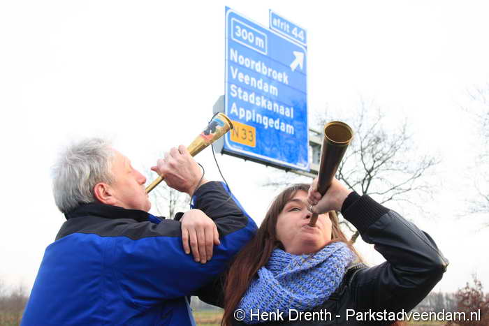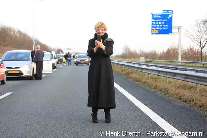 De deelnemers stapten uit en het gaf een heel aparte sfeer, er gebeurde iets uitzonderlijks. Niet iedere automobilist was er blij mee overigens, maar men beruste er meestal wel in. Een Duitse personenwagen met jonge inzittenden reed over de vluchtstrook om er voorbij te komen, maar werd vooraan door de politie staande gehouden. Daar konden ze ook niet verder. Een Duitse wagen met caravan was ook vast komen te zitten. En de bestuurder was met zijn vrouw ook uitgestapt. Het was een Fries echtpaar dat in Duitsland was gaan wonen, en op weg was naar Friesland. In Winschoten was de hele bups erop gekomen, en er was geen ontkomen meer aan. Maar de inzittenden Erick en Ankie waren via de laptop al op de hoogte. Het oponthoud namen ze voor lief. Ze spraken hun volledige solidariteit uit. We doen gezellig mee, zei Ankie lachend.