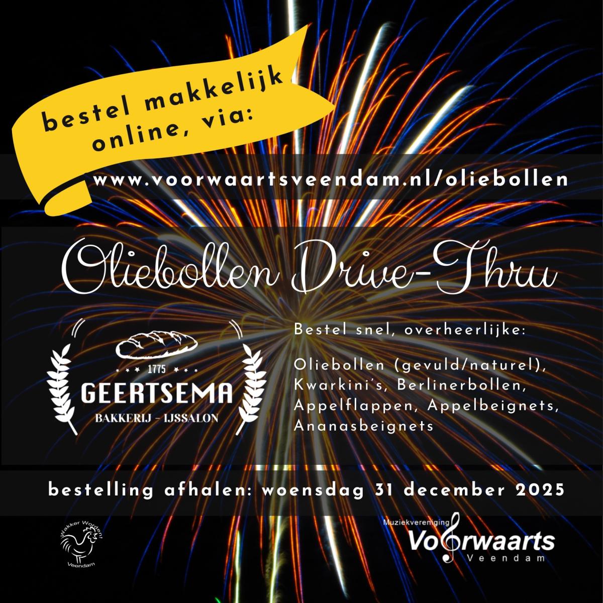 Muziekvereniging Voorwaarts Veendam organiseert op woensdag 31 december opnieuw haar populaire Oliebollen Drive‑Thru. In samenwerking met Bakkerij Geertsema uit Muntendam worden ook dit jaar weer diverse oudjaarslekkernijen aangeboden, waaronder oliebollen, kwarkini’s, appel‑ en ananasbeignets, berlinerbollen en appelflappen.
