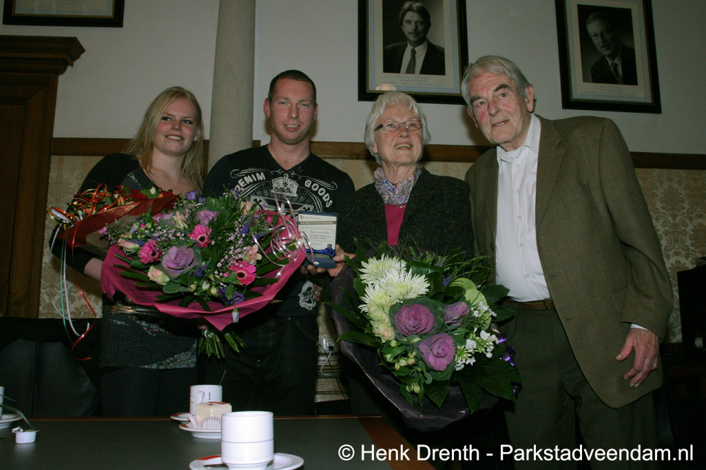 Erwin van der Velde kreeg vanmiddag de ‘Penning van verdienste' uit handen van burgemeester Meijerman voor zijn reddingsactie van een echtpaar uit Assen die vorig jaar november met hun auto in het Beneden Oosterdiep waren beland door slecht zicht en een verkeerde afslag. Van der Velde haalde het echtpaar uit het ijskoude water.