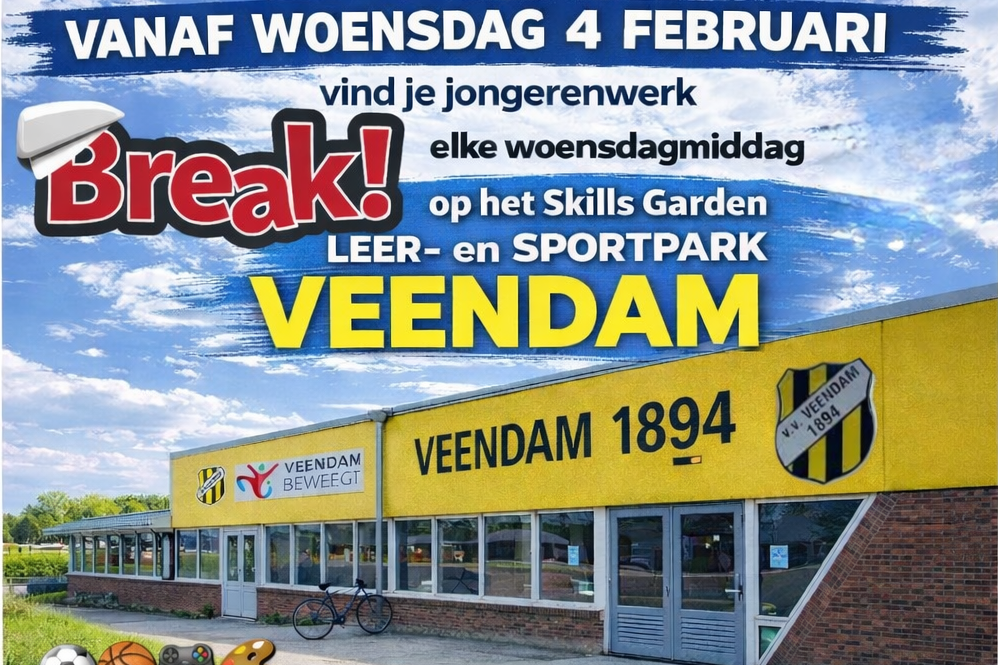 Jongerenwerk Break! krijgt vanaf woensdag 4 februari een nieuwe vaste plek voor de woensdagmiddagen. Voortaan zijn jongeren welkom in de kantine van v.v. 1894 op Skills Garden Leer‑ en Sportpark Veendam. De eigen locatie van Break! is op woensdagmiddagen vanaf die datum gesloten.