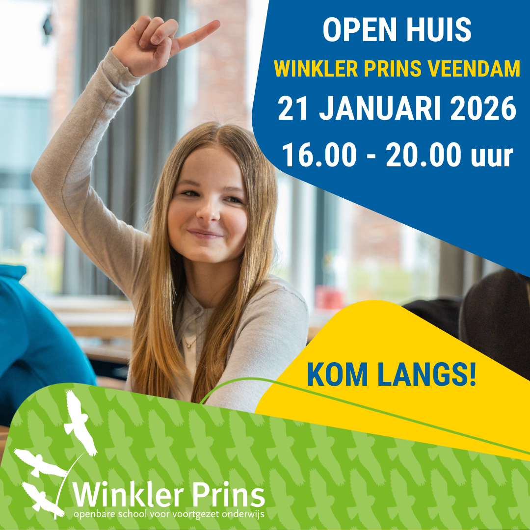 Woensdag 21 januari van 16:00 tot 20:00 uur staan de deuren van Winkler Prins open voor leerlingen uit groep 7 en 8 en hun ouders. Ook zij‑instromers uit het voortgezet onderwijs zijn van harte welkom. Tijdens het Open Huis kunnen toekomstige leerlingen zelf ervaren dat leren bij Winkler Prins meer is dan alleen met de neus in de boeken: het is ontdekken, doen en samen plezier maken.