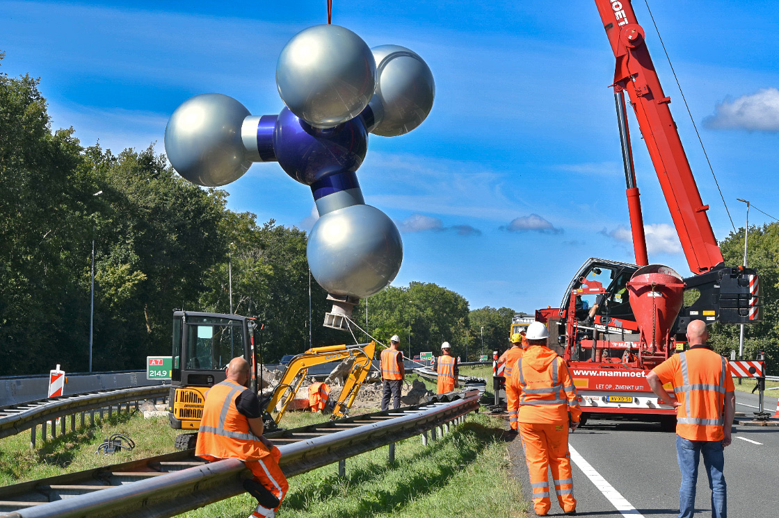 Zaterdagmorgen is het kunstwerk ‘het Gasmolecuul’ van kunstenaar Marc Ruygrok van zijn plek uit de middenberm van de A7 verwijderd. Het kunstwerk is met een kraan van zijn plek getakeld en vervolgens getransporteerd naar de carpoolplaats bij de afrit Hoogezand van de A7. Daar is het voorzichtig uit elkaar gehaald. Daarna wordt het naar een speciale werkplaats vervoerd voor restauratie.