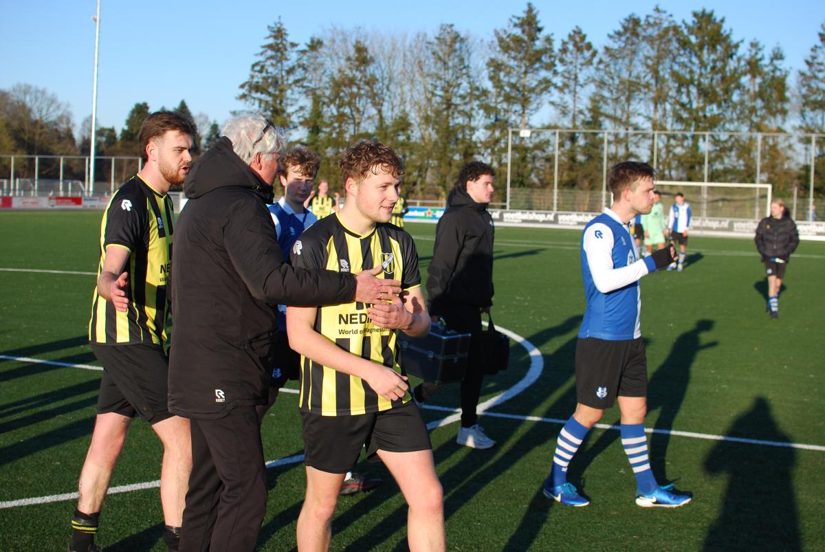 Daarna vraag ik Veendam 1894-hoofdtrainer Armand Mac Andrew hoe hij de moeizame winst had ervaren. Mac: ‘Nee, dit was geen wedstrijd voor hartpatiënten. Ja, op het laatst hadden we het nog heel moeilijk. Dit wat trouwens een wedstrijd die we veel eerder in het slot hadden kunnen gooien. Zij namen op een gegeven moment heel veel risico en in de counter hadden we veel meer moeten doen. Dan zijn we te onrustig. En daardoor blijft het heel lang spannend. In met name de eerste helft hadden we er meer uit moeten halen. Rommelig? Ja, dat klopt wel. Het is ook een pittige tegenstander. Dat vond ik in de thuiswedstrijd van ons ook hoor. Toen wonnen we weliswaar met 5-0 maar vond ik ze zeker niet slecht. Het doel vandaag was: drie punten. We moeten bijblijven, in ieder geval tot 4 april. Dan spelen we tegen Wildervank. Dat zou dan weleens om de tweede periode kunnen gaan. Daar gaan we voor. Ja, precies: win zulke wedstrijden als vandaag maar eens. De laatste drie tegenstanders is het niet gelukt. Ze winnen niet voor niks dik van TKB. Ze hebben een goed voetballend ploegje. We hebben een paar weken niet gevoetbald. Dat merkte je. Vooral in de opbouw van achteruit. We kregen alle ruimte maar kozen toch steeds voor de lange bal. En dat zie ik liever niet. Want je speelde de bal steeds in de ruimte waar zij een overtal hadden. Dat is niet handig. We maakten een fantastische eerste goal, maar er is nog wel werk aan de winkel.’