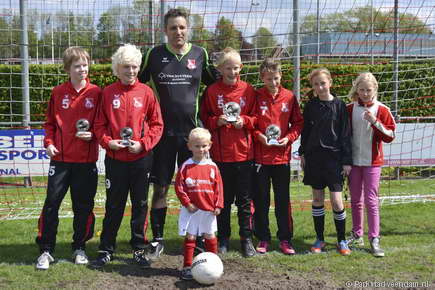Op de foto staan v.l.n.r. Robbert Duintjer, Xavier Heijmel, Reservedoelman Andre Smallenbroek, Thijs Bos, Seán mc Tique, jeugsdcheidsrechter Charissa de Groot, Danique de Groot en op de voorgrond Damilo de Groot.