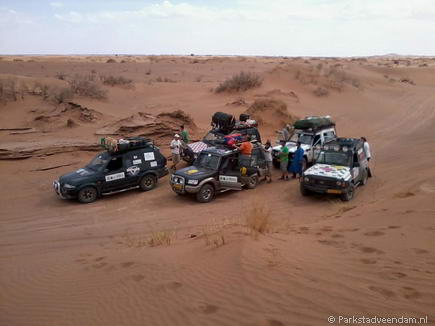 Niet zonder slag of stoot, zo is gebleken de afgelopen weken. Kapotte schokdempers, lekke banden, vastzitten in het woestijnzand alles moet ter plaatse geregeld worden.