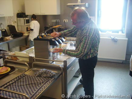 KOK - Wie is die vreemde snoeshaan in de keuken van werkvoorzieningsschap Wedeka in Veendam. Het is werkleider Jan Kalk van de groenvoorziening. Jan zei: ‘ik heb lang genoeg in de buitenlucht gewerkt, nu wil ik de laatste jaren van mijn arbeidsbestaan onderdak werken". Uit betrouwbare bronnen is Jan bezig met een omscholing. Van hovenier dus naar kok. Menigeen bij het schap zal er waarschijnlijk om lachen, maar zo vreemd is zijn redenering niet. Jan is ook niet de jongste meer en een beetje dichter bij de warme kachel bivakkeren is voor Jan een zegen. Wanneer de cursus afgelopen is, is niet bekend. Maar dat zal wel niet te lang duren, aangezien Jan de kunsten van het koken nu al aardig onder de knie begint te krijgen. Een tweede Joop Braakhekke bedient het Wedeka personeel misschien over een paar weken.