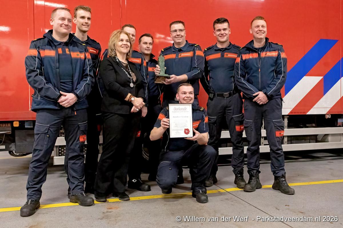 De jury roemt de uitzonderlijke prestaties van het korps in 2025. De wedstrijdploeg behaalde de eerste plaats in de landelijke finale van de brandweerwedstrijden in de klasse brandbestrijding. Daarnaast gingen drie individuele titels naar Veendam: Peter Noordegraaf werd uitgeroepen tot beste bevelvoerder, Robert Boswijk tot beste chauffeur en Ramon Dijk tot beste brandweerman van Nederland. Volgens de jury onderstrepen deze prestaties de professionaliteit, samenwerking en kwaliteit van het korps, zowel binnen Veendam als in de regio. In het juryrapport staat dat de brandweer een zichtbare en betekenisvolle rol vervult en bijdraagt aan een positief imago van de gemeente. De vrijwilligers laten volgens de jury zien waar Veendam voor staat: samen de schouders eronder zetten, verantwoordelijkheid nemen en er zijn voor elkaar.