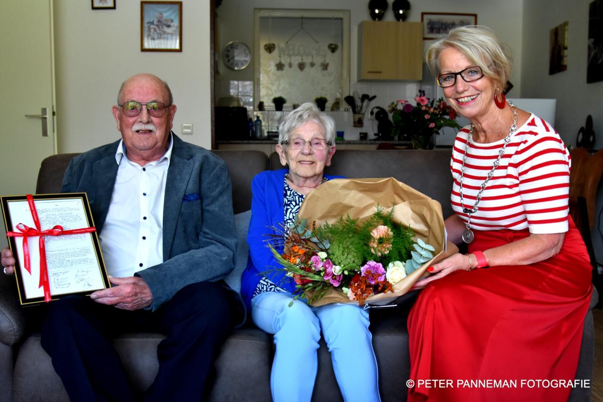 Het echtpaar Henk Grupstra (87) en Renske Grupstra-de Groot (87) vieren vandaag hun 65-jarig huwelijk. Locoburgermeester Ans Grimbergen kwam het briljanten bruidspaar persoonlijk op hun huisadres feliciteren met een kopie van de originele trouwakte en een fraai boeket bloemen.