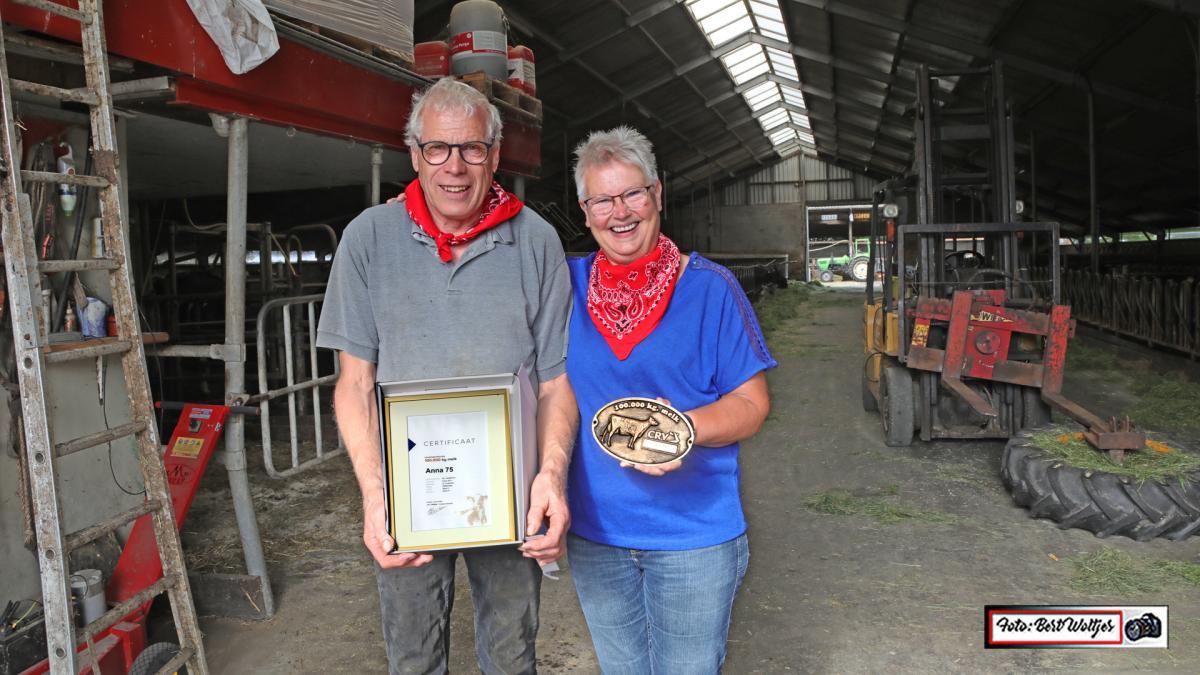 Bij veehouder Laarman aan de Landbouwstraat in Wildervank was het woensdagmorgen feest want melkkoe Anna 75 had het gepresteerd om in dik 14 jaar tijd 100.000 liter melk te geven, en dat is voor een koe best een prestatie.