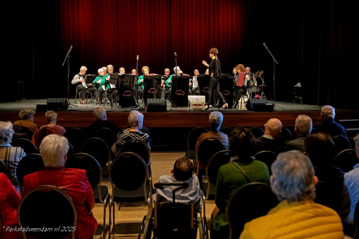 Accordeon Orkest Fresco repeteert dus wekelijks, maar ook hebben ze elke maand wel een optreden. Dat kan zijn in bijvoorbeeld De Breehorn, het A.G. Wildervankhuis, De Veenkade of een ander verzorgingshuis in Veendam en/of regio. Daarnaast reist het gezelschap regelmatig af naar dit soort accommodaties in Borger of zelfs Roden. Het orkest heeft ook menigeen kunnen amuseren tijdens de optredens in Cultuurcentrum vanBeresteyn bij de Koopavondconcerten. Toos: “Oh, oh, wat jammer dat dit verleden tijd is. De avonden waren gratis toegankelijk, waardoor iedereen van de muziek kon genieten.”