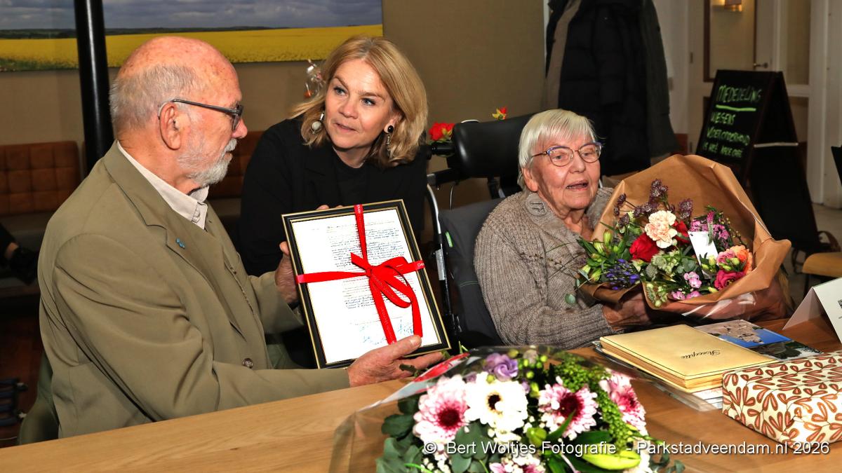 Een bijzondere mijlpaal in de Veenkade in Veendam: het echtpaar Marinus en Kina Boelens‑Grofsmid vierde vandaag hun 60‑jarig huwelijk. Burgemeester Annelies Pleyte bracht het diamanten paar vanmorgen een feestelijk bezoek namens de gemeente Veendam. Zij overhandigde een grote bos bloemen en een ingelijste kopie van de originele trouwakte.