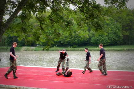 Op een vlonder bij de Borgerswoldhoeve voor het terras konden de bezoekers menig maal genieten van een show. Zo lieten de heren zien wat Systema inhoudt, werd er een stukje over de geschiedenis verteld en natuurlijk werd er op het podium ook gevochten.