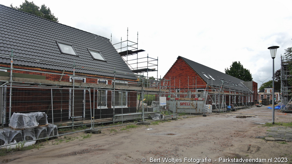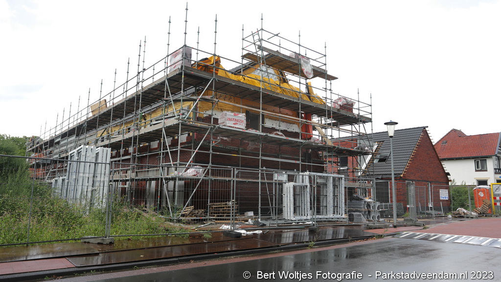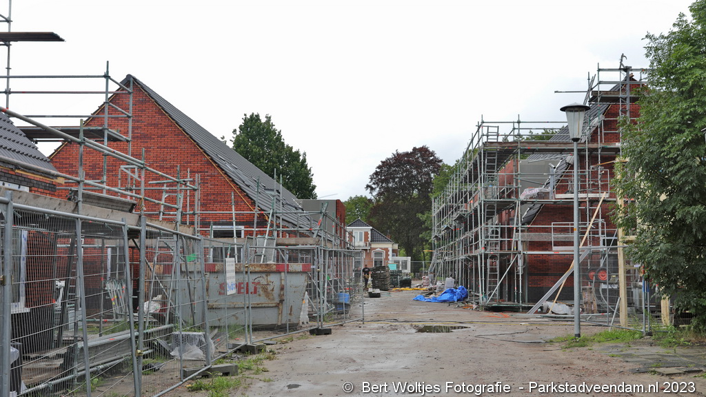 Al een half jaar is men bezig met de bouw van 6 eengezins- en 10 levensloopbestendige woningen aan de 11e Laan in Wildervank in Veendam. Een deel van de steigers is deze week weggehaald. De komende 3 weken is het voor de bouwvakkers vakantie, maar een deel van het werk gaat nog gewoon door. Naar verwachting zijn de woningen eind dit jaar klaar. Vroeger stonden hier de gebouwen van de Veenkoloniale Boerenbond, de papiergroothandel van Scholtens en de roemruchte discotheek De Kibbekoele en later Danceworld.
