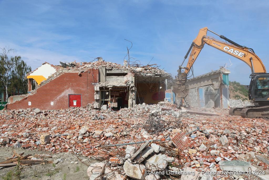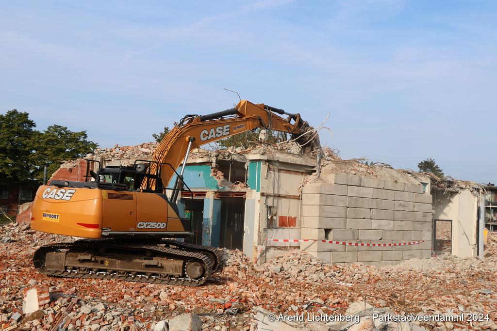 De wandschildering van Jan van der Zee uit 1958 in de oude LTS / Winkler Prins in Veendam is sinds dinsdag een zelfstandige muur. Sloopaannemer Revoort b.v uit Tweede Exloërmond heeft het schoolpand om de wandschildering inmiddels gesloopt. De verwachting is dat vrijdag (6-9) het schoolgebouw aan de Pinksterstraat verleden tijd is.