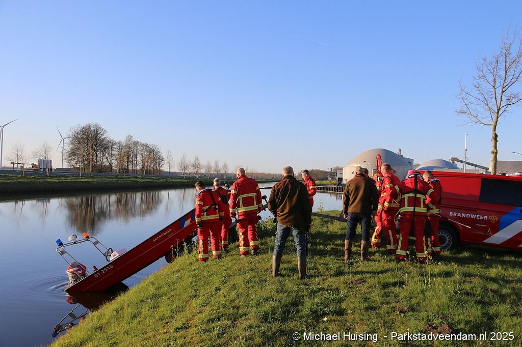 De brandweer kwam ter plaatse met twee voertuigen en een boot. De boot werd te water gelaten aan de Spoorhavenweg. Vervolgens werd het kanaal afgezocht richting de Billitonweg en daarna nog richting de brug bij Meeden.