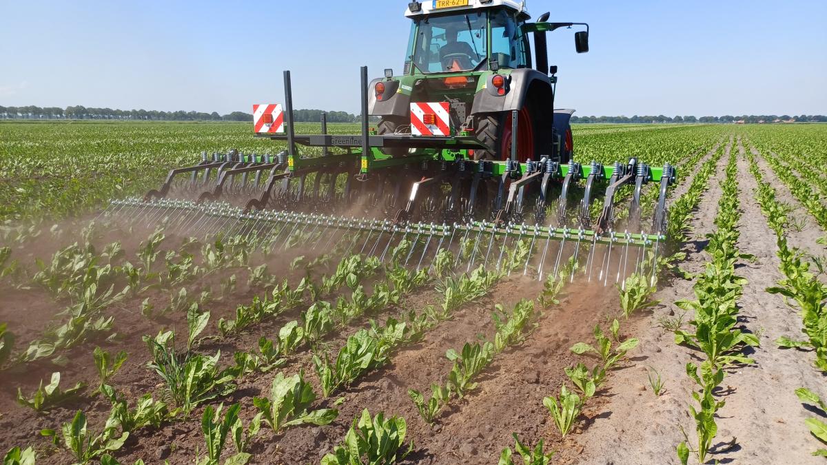 De rotorwieder ontwortelt en verwijdert onkruid in de chicorei, maar voorkomt dat zand gaat stuiven. Akkerbouwer Harry Geling wil minder middelen gebruiken, iets waar volgens hem niet aan te ontkomen valt als hij naar de toekomst kijkt. ‘Ik wil graag meer mechanisch onkruid bestrijden, als het maar het juiste effect heeft.’ Daarom koos de akkerbouwer voor een rotorwieder. Hij teelt op Groningse veenkoloniale dalgrond. ‘De grond hier is erg stuifgevoelig. Als de grond te fijn wordt, zoals met een wiedeg gebeurt, stuift het zand over het perceel. Dat schuurt de plant.’ De rotorwieder laat de grond namelijk grof achter, in tegenstelling tot de wiedeg en schoffel.
