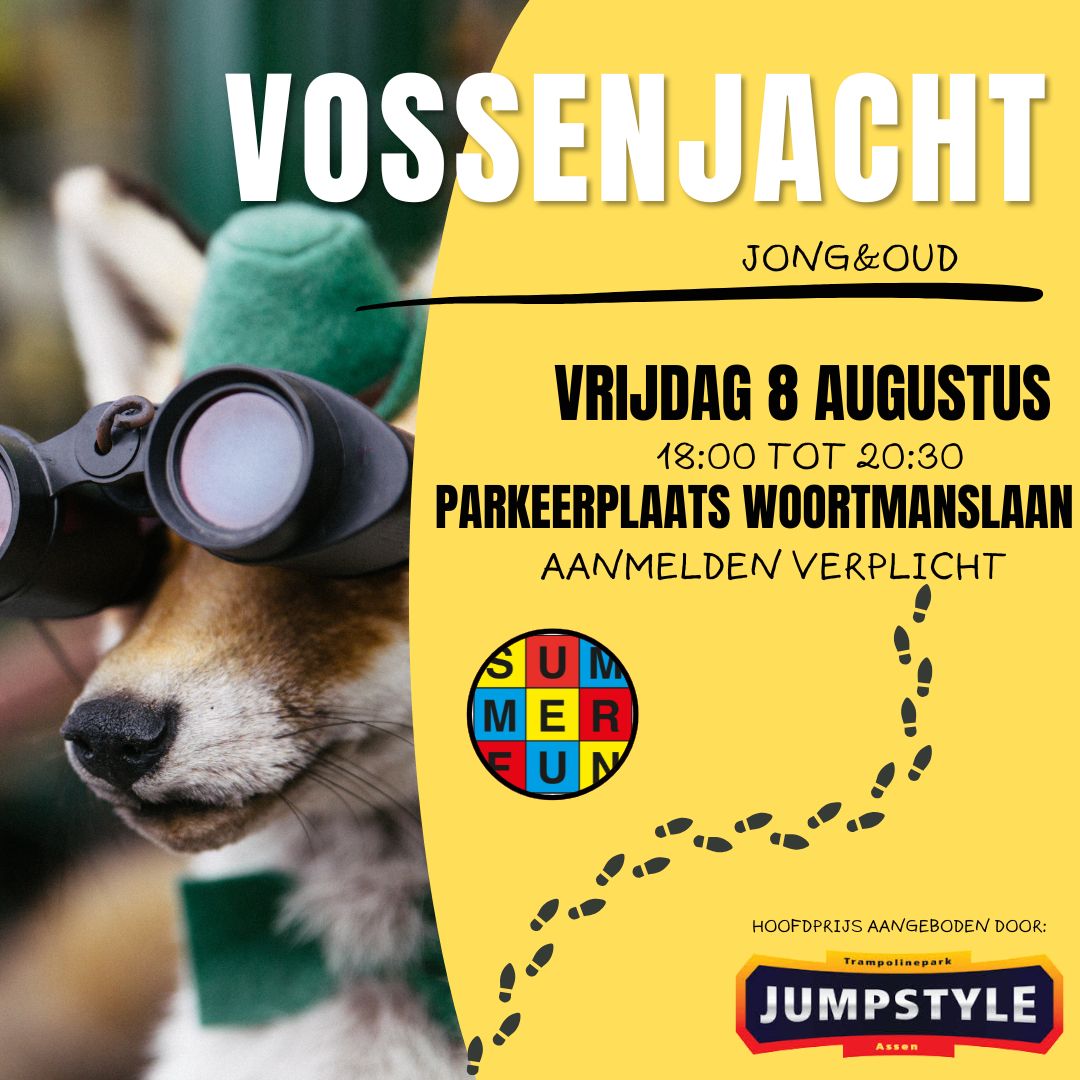 Tijdens deze vossenjacht gaan teams (Jong&Oud) de strijd tegen elkaar aan om zoveel mogelijk punten te verdienen bij verschillende challenges die ze uitvoeren bij de vossen. Maar voordat je een challenge kan doen, moet je natuurlijk wel eerst de vossen zien te vinden. En natuurlijk ligt er voor het team met het meest behaalde aantal punten een mooie prijs klaar, namelijk 5 kaartjes om met elkaar een uur gratis te kunnen springen bij Jumpstyle Assen.