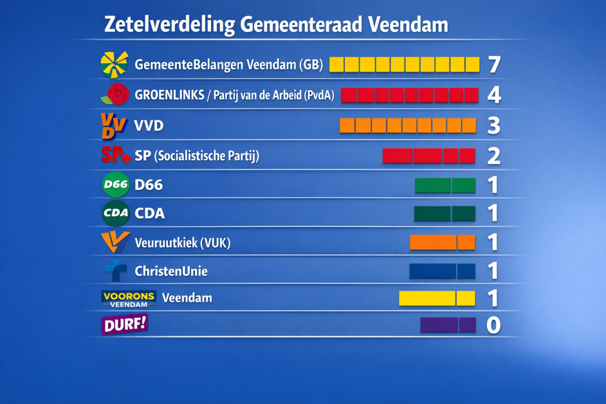In de raadzaal van het gemeentehuis is vanochtend om 10:00 uur de definitieve uitslag van de gemeenteraadsverkiezing in Veendam vastgesteld. Tijdens de openbare zitting van het Centraal Stembureau werd de uitslag voorgelezen en kregen aanwezigen de mogelijkheid om mondeling bezwaar te maken. Er zijn geen bezwaren ingediend, waardoor het proces-verbaal direct kon worden ondertekend en de uitslag officieel definitief is.