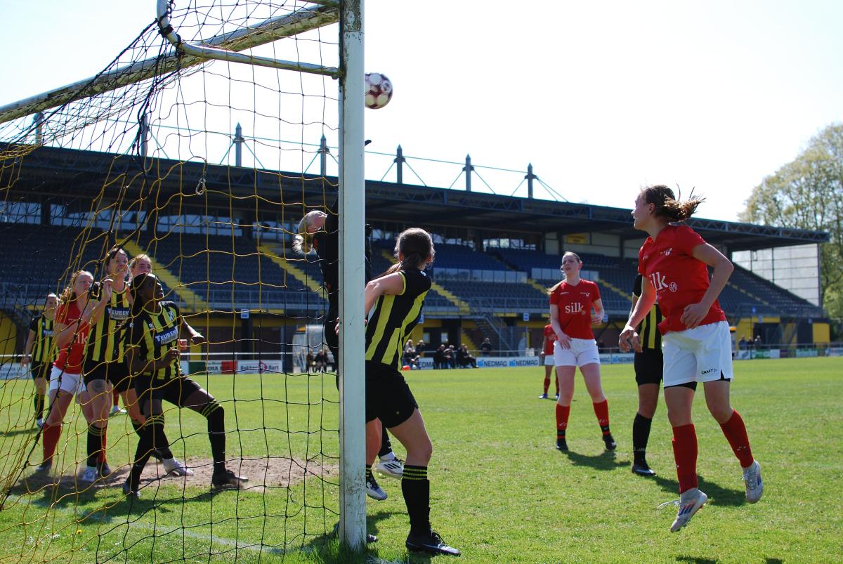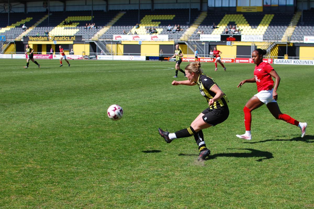 Vond Bente van Vondel dat ook? Kort na de wedstrijd doe ik op het veld met deze strijdlustige verdedigster het flashinterview. Bente: ‘Ik vind het heel zuur. We bikkelen zo hard. Het zit een beetje mee en dan krijgen we zo’n vreselijke kutgoal tegen. Het was van hun kant een hele goede goal maar wij stappen niet op tijd uit naar degene die die voorzet geeft. Ja, dat hadden we als team moeten doen. We knokken ons inderdaad knap terug in de wedstrijd. En dan wordt het chaotisch in de slotfase. Dan zorgen we er anders altijd voor dat we geen doelpunt meer tegen krijgen. Helaas lukte dat vandaag niet. Een puntje was voor ons genoeg geweest. Maar ja, vijf wedstrijden geleden zei ik dat we 15 punten wilden halen. Dat is dus niet gelukt. Dat is jammer. Ja, het klopt wel hoor dat zij elkaar wat gemakkelijker vonden en beter aan de bal waren.’
