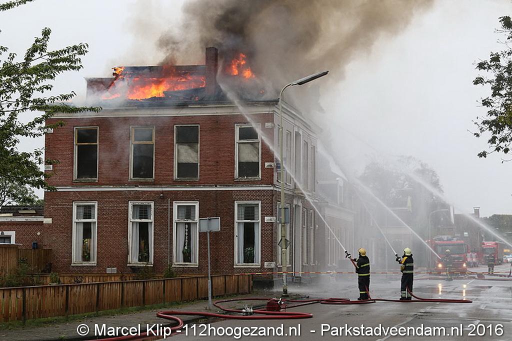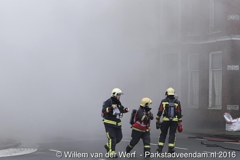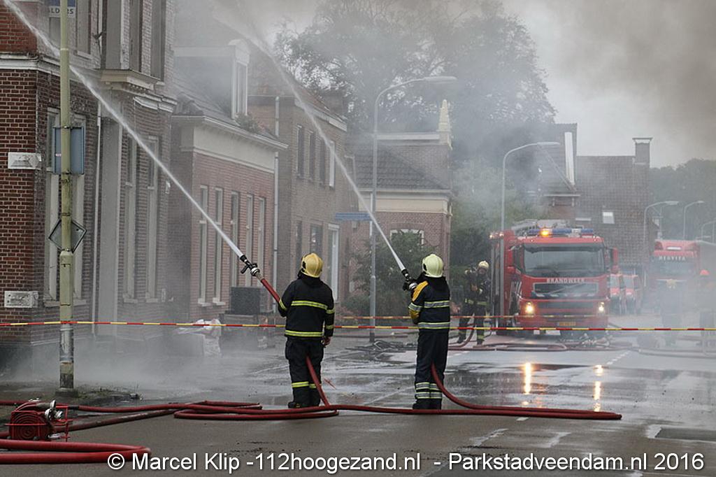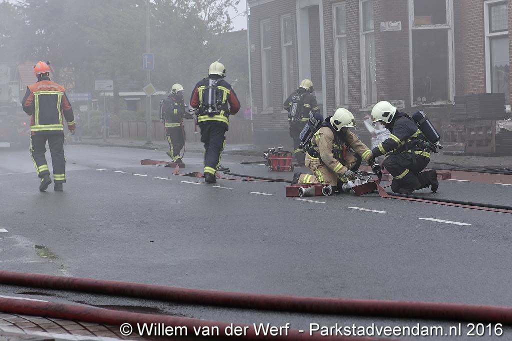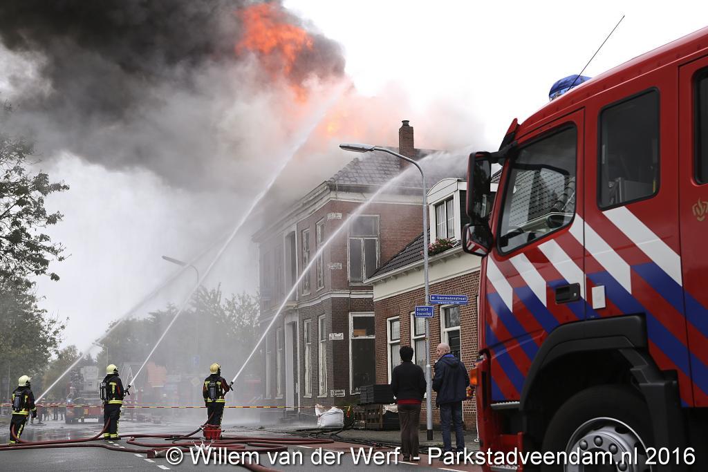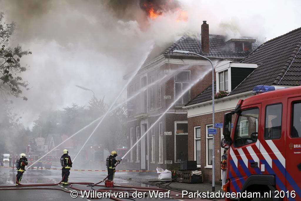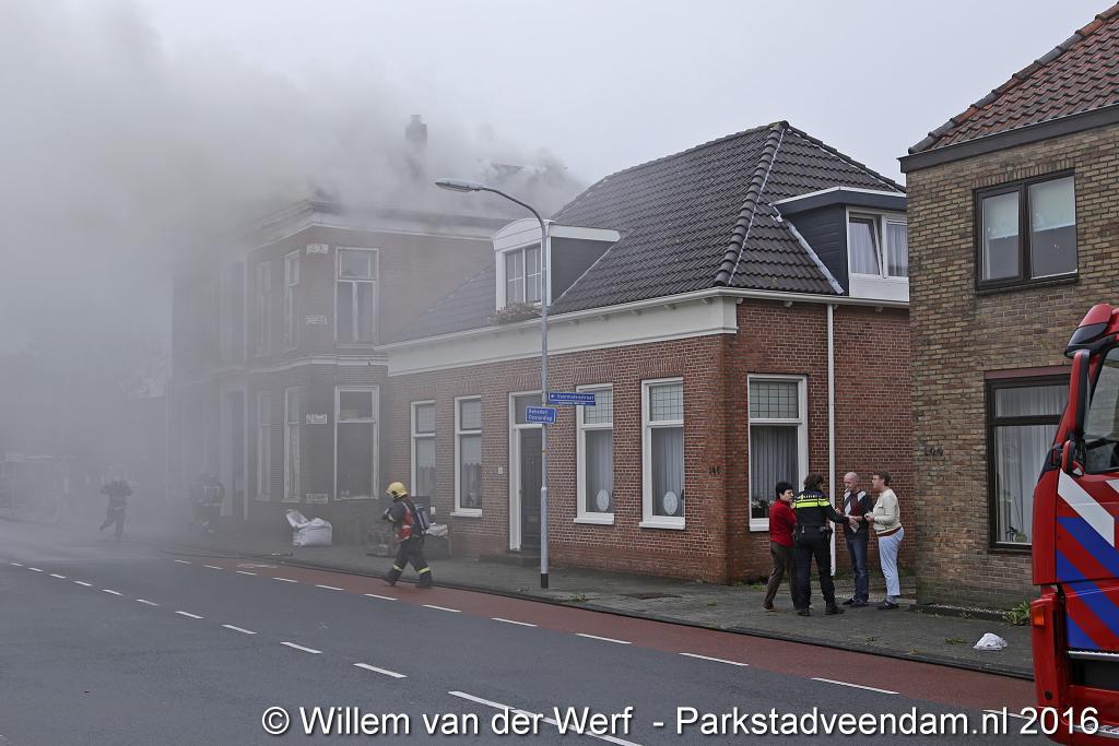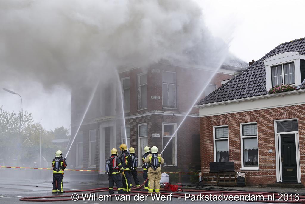 De bewoners van het pand konden op tijd wegkomen. De Veendammer brandweer is met meerdere voertuigen aanwezig. De brand wordt alleen vanaf de zijkant geblust omdat de gevel instabiel is.