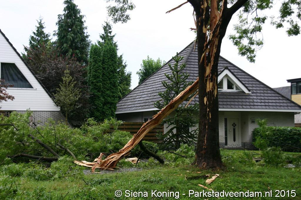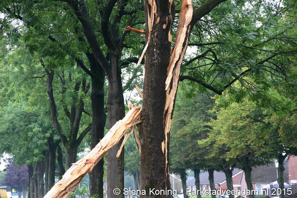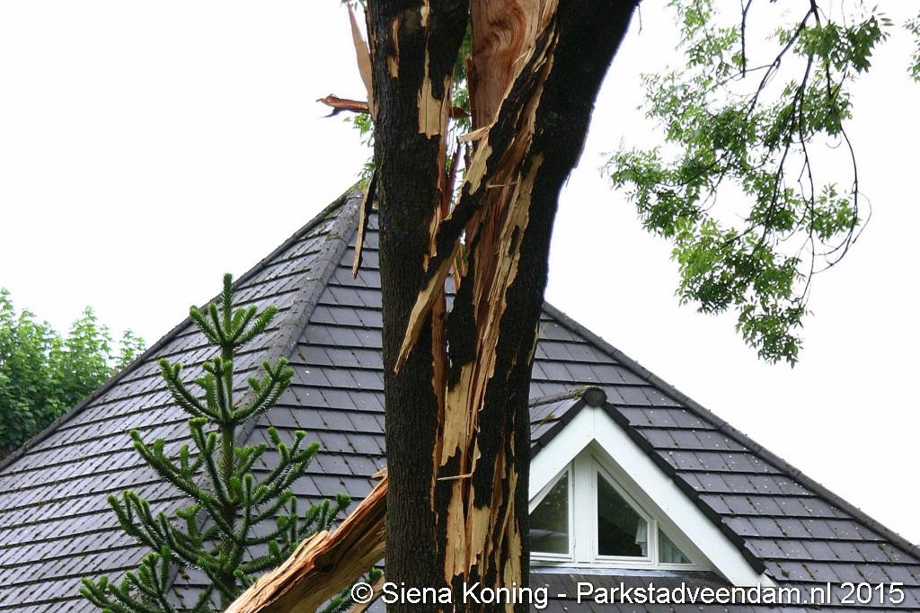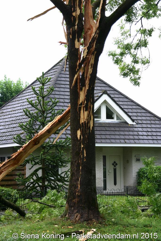 De boom is hierbij helemaal uiteen gereten en dikke takken lagen over de weg. Dat zo'n boom splijt komt omdat bij de inslag de sappen in de boom verdampen en niet weg kunnen, de druk zorgt er dan voor dat boom scheurt en uit elkaar spat.