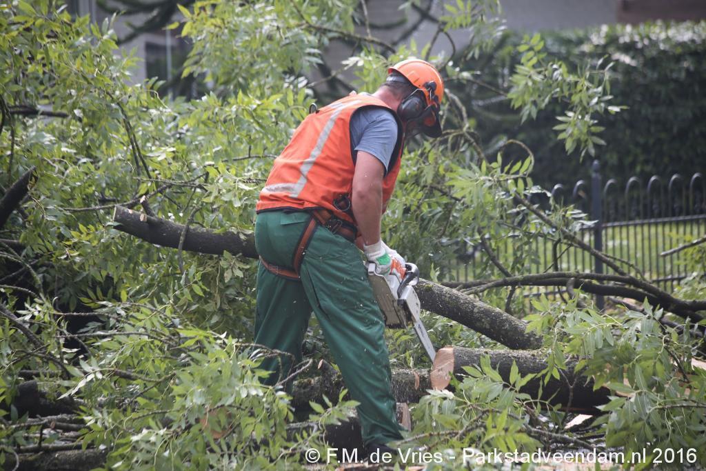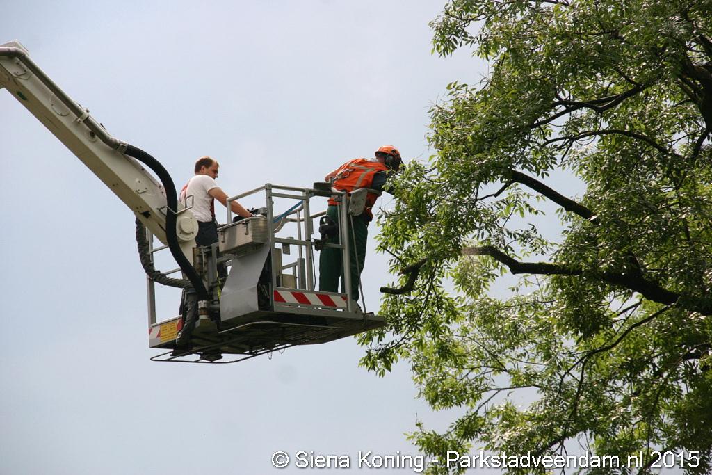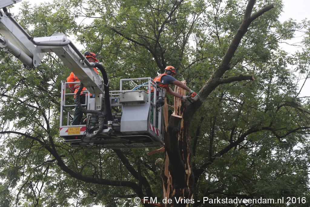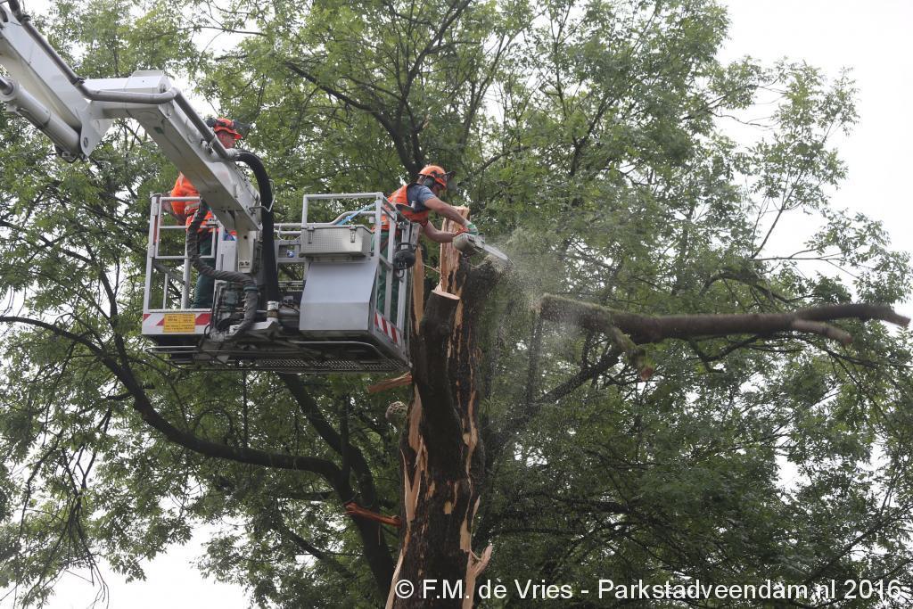 De mannen van de gemeente hebben samen met de brandweer, met twee voertuigen ter plaatse, de boom stukje voor stukje geveld.