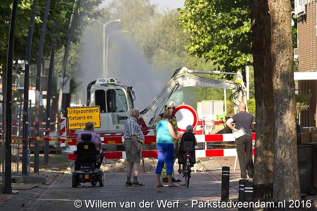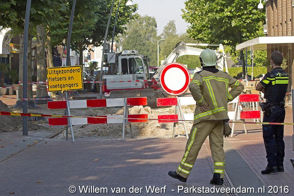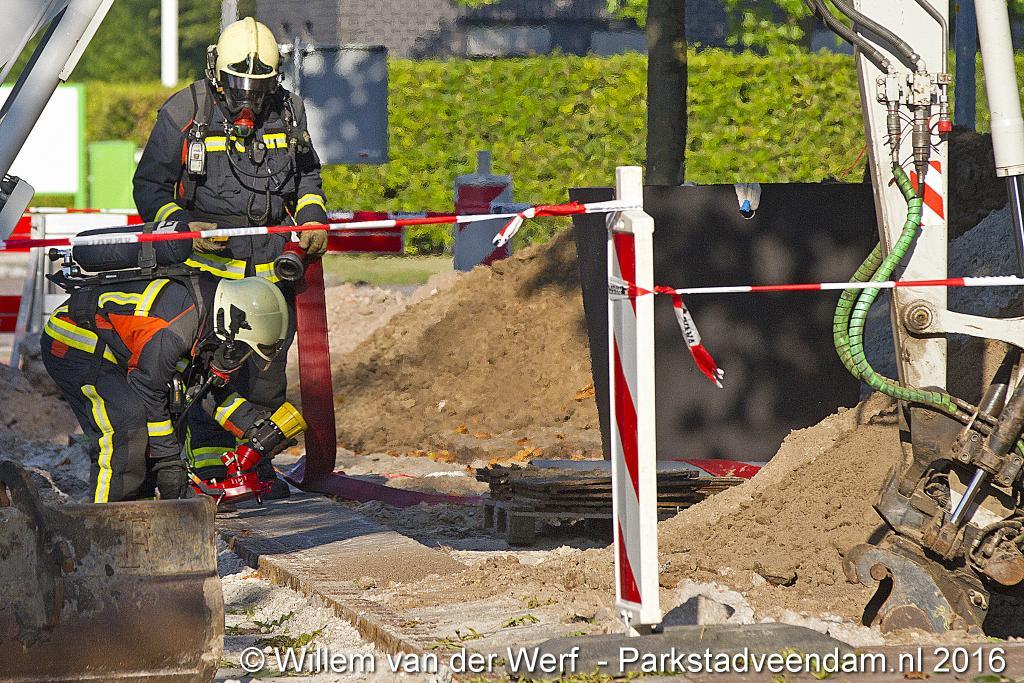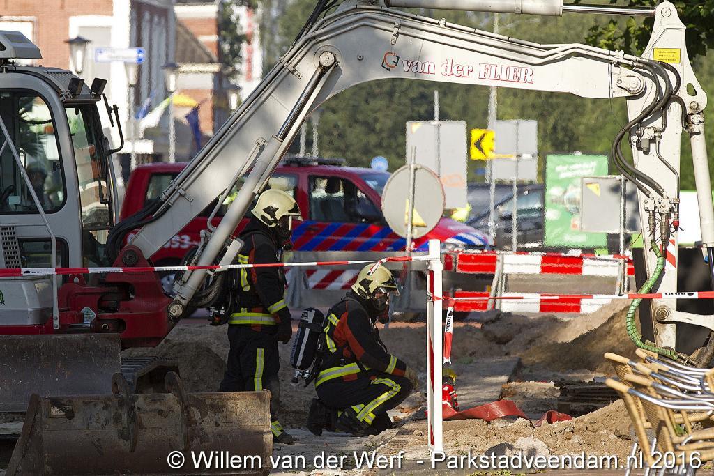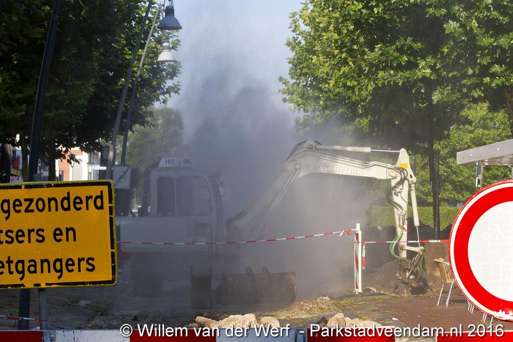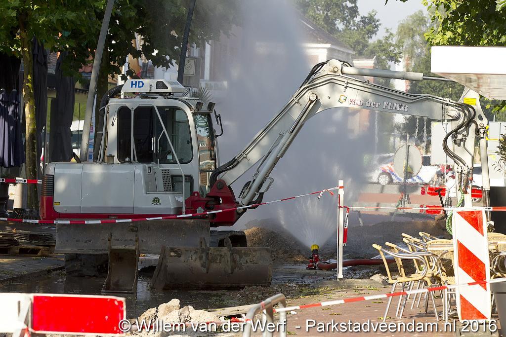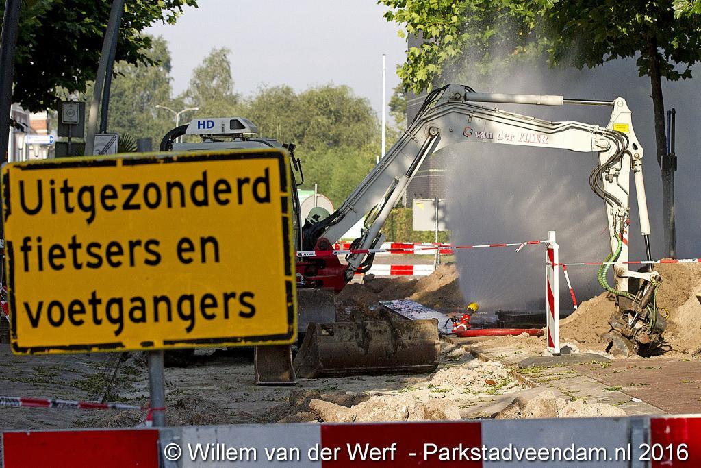 KERKSTRAAT – Vrijdagmorgen is bij de herinrichting van de Kerkstraat-West een gasleiding geraakt door een graafmachine. Dat gebeurde om half 9.