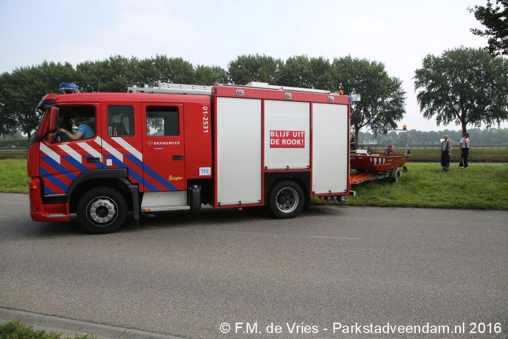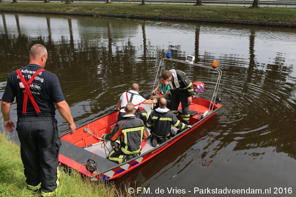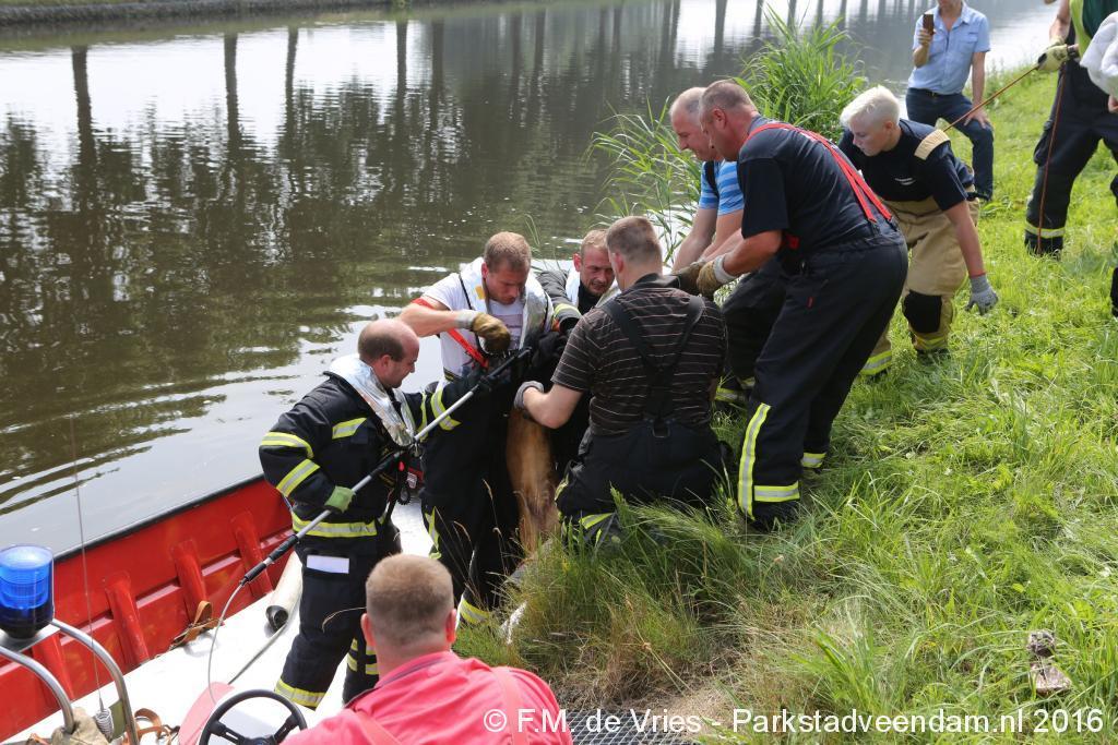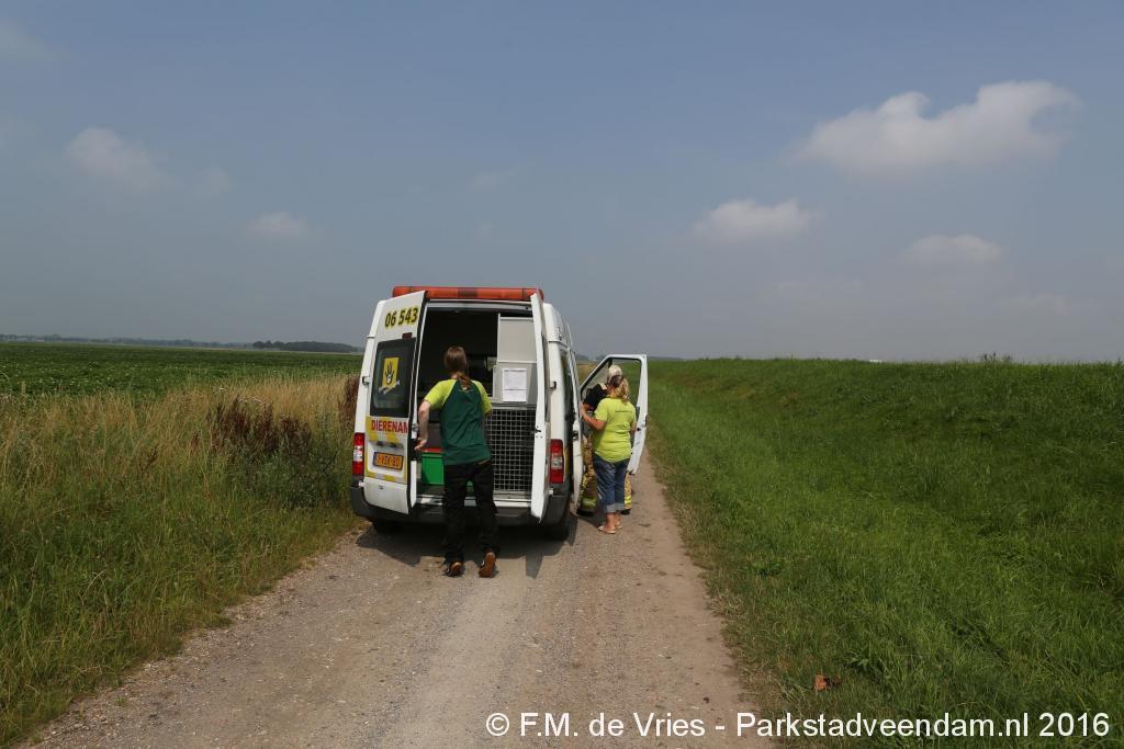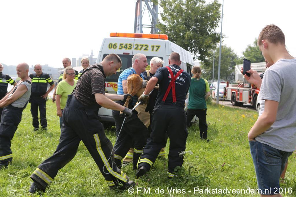 De brandweer, die met twee voertuigen ter plaatse kwam, heeft een boot ter water gelaten. De spuitgasten konden het dier nu makkelijker benaderen en aan boord trekken. Nadat het dier aan wal was gebracht, hebben enige spuitgasten samen met medewerkers van de dierenambulance het dier los gelaten in een veld.