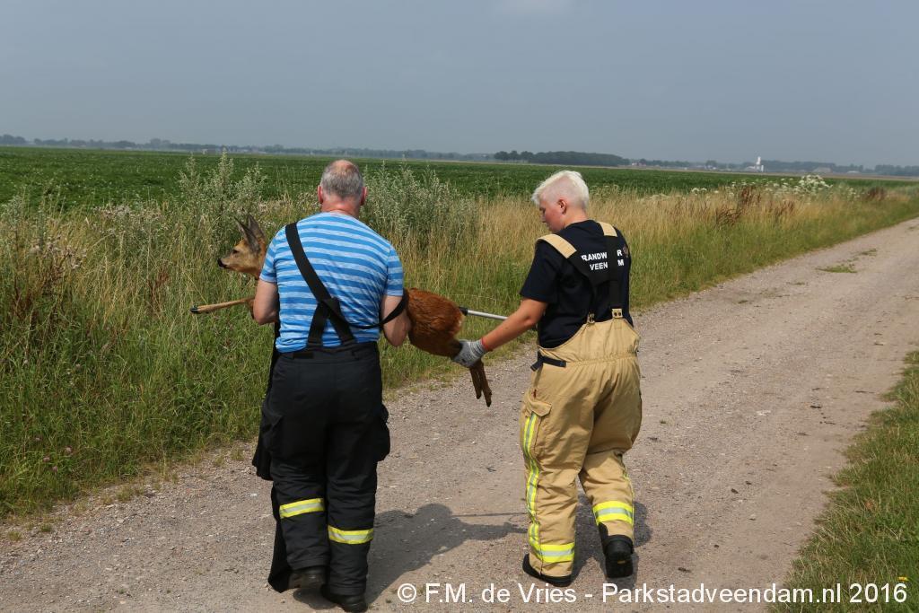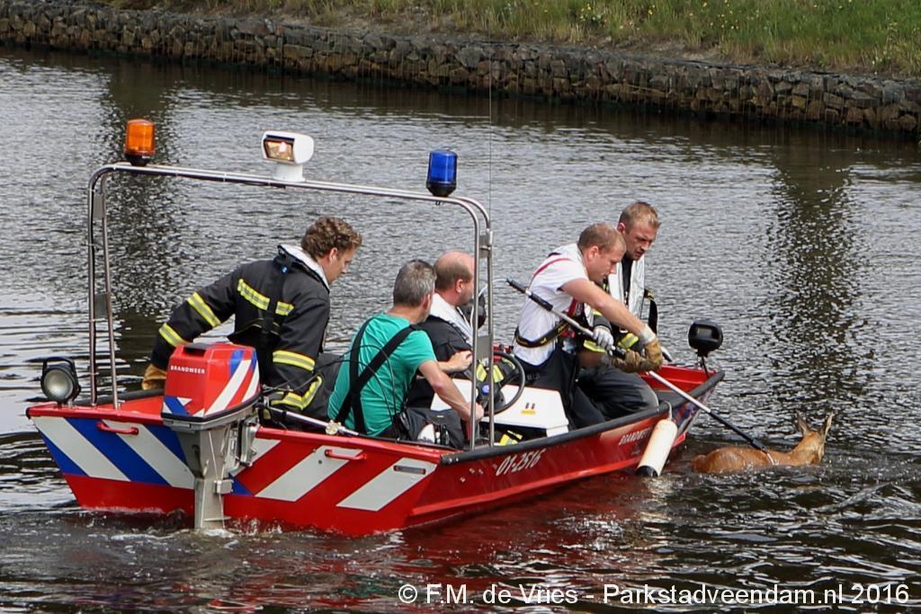 SPOORHAVENWEG - Zondagmiddag kregen de spuitgasten van de brandweer Veendam een melding dat er zich een ree in het A.G. Wildervanckkanaal bevond.