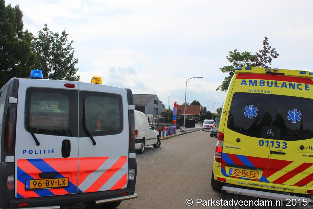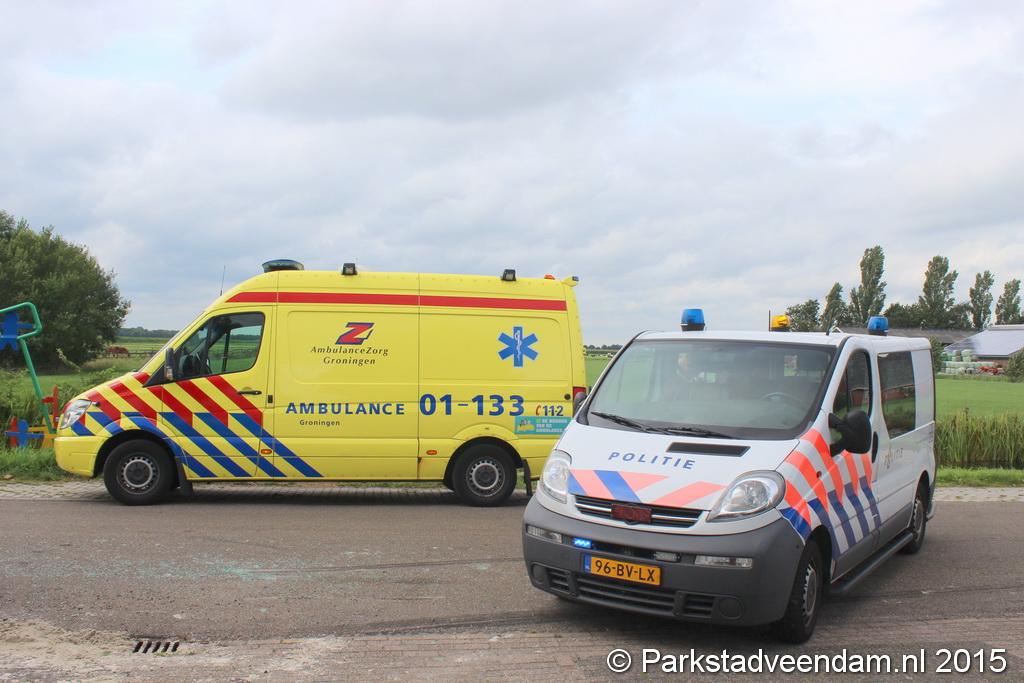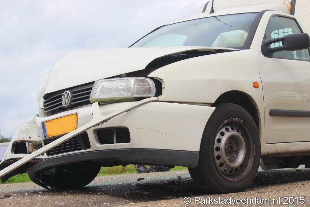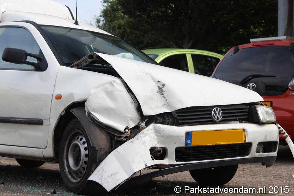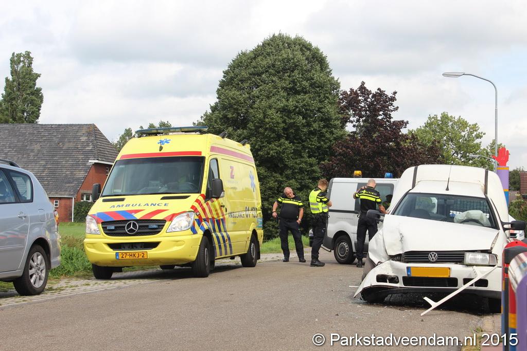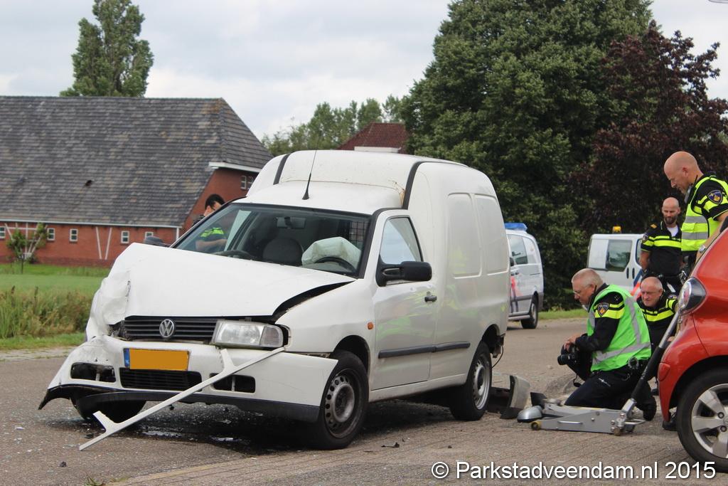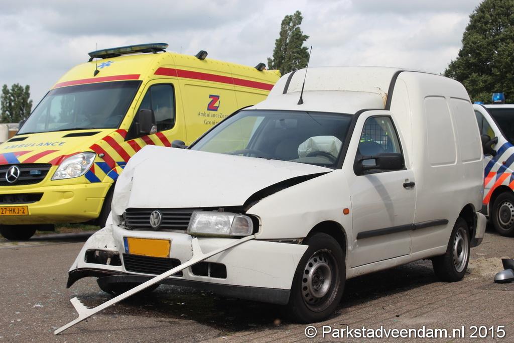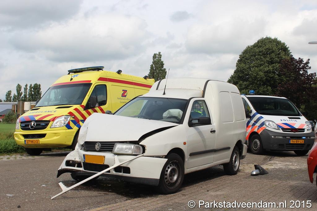 Een 27-jarige vrouw uit het Drentse Nieuwediep met haar kind van 2,5 jaar (grijze Renault) had de knipperlicht naar rechts uit staan. De bestuur van een VW Caddy, een 53-jarige man uit Veendam, passeerde links om er voor bij te gaan. Onverwachts sloeg de vrouw links af een parkeerplaats op. Hierdoor ontstond een forse aanrijding. De aanhangwagen achter de Caddy had zich vanachteren in de auto geboord. De man is met nekklachten naar het ziekenhuis vervoerd. Ook de vrouw en de baby zijn ter controle naar het ziekenhuis gebracht. Het is verkeer is omgeleid en de ongevalsanalyse dienst heeft alles vastgelegd