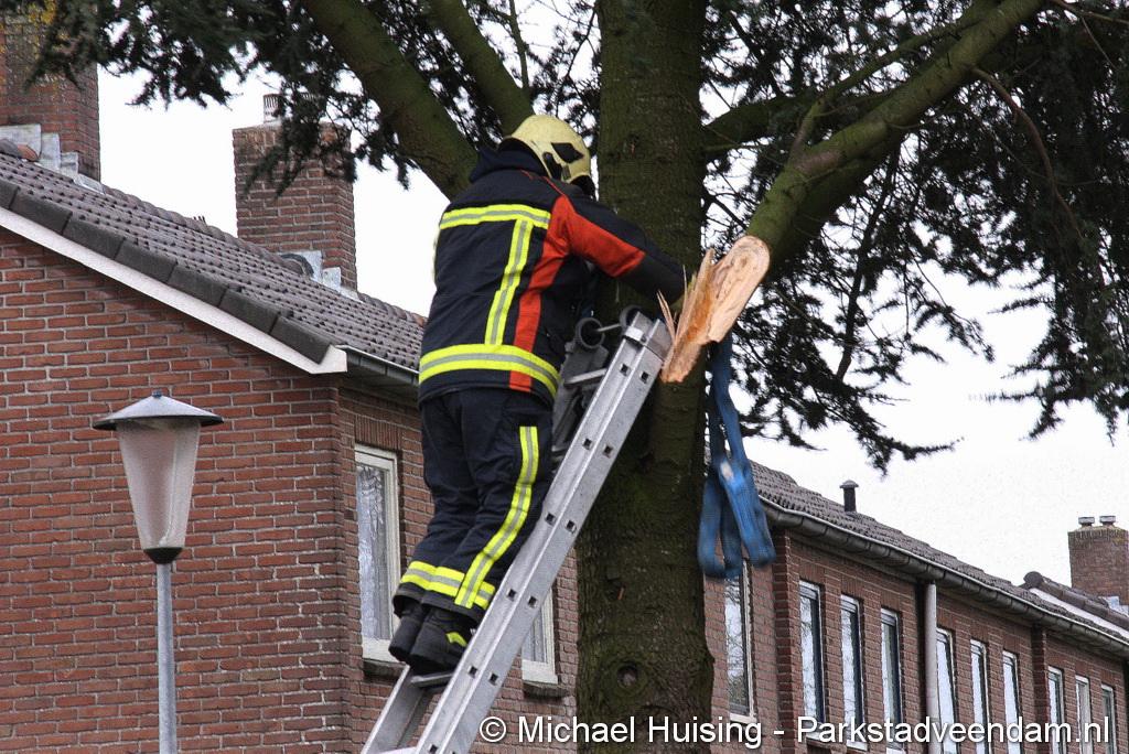 Later op de middag moesten ze naar de Voormolenstraat. Hier stond een naaldboom naast een woning behoorlijk te zwiepen. Het gevaar was dat de boom op de weg of de woning zou vallen. Daarom is de boom neergehaald, waarna deze in stukken is gezaagd en afgevoerd.