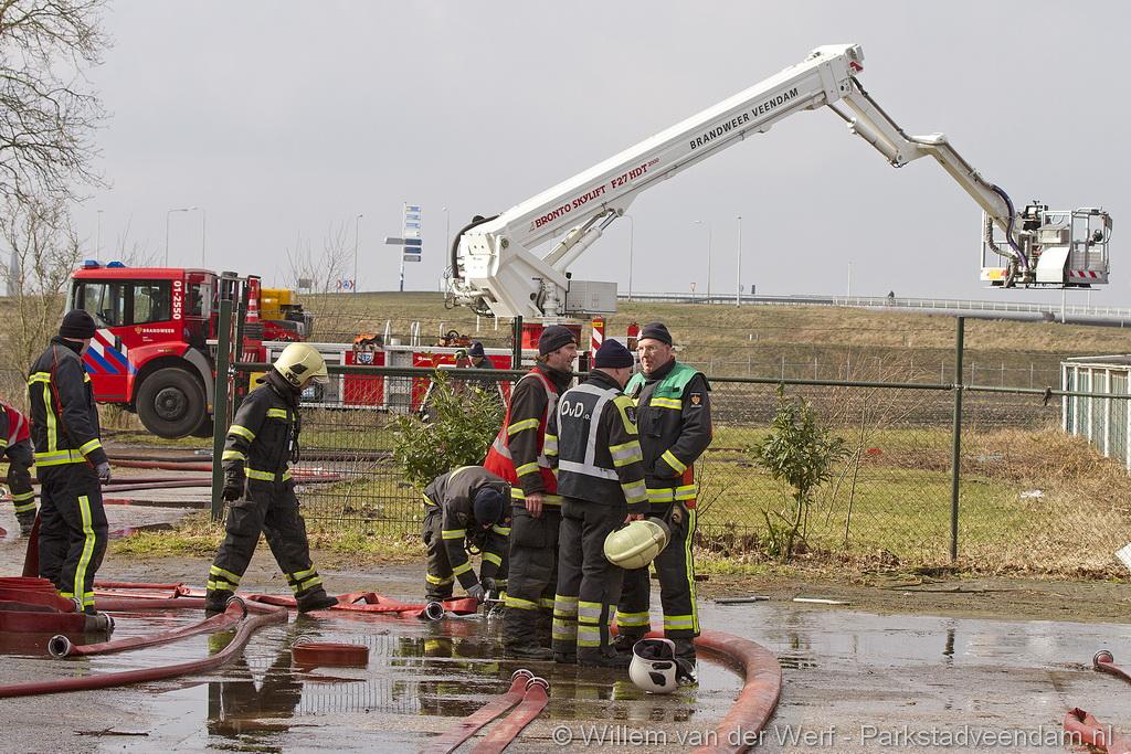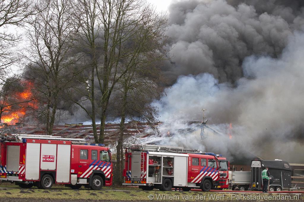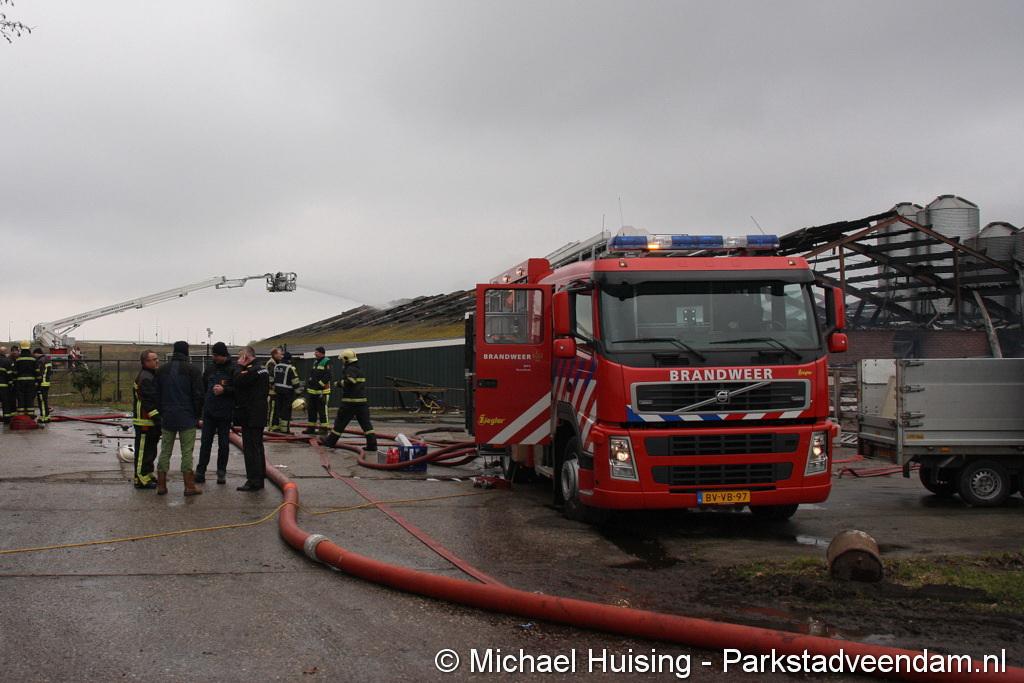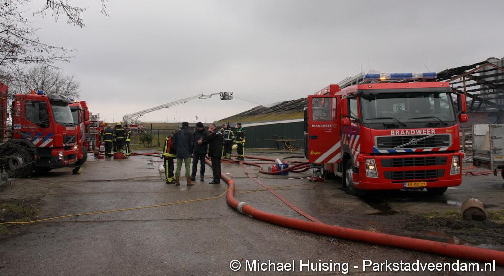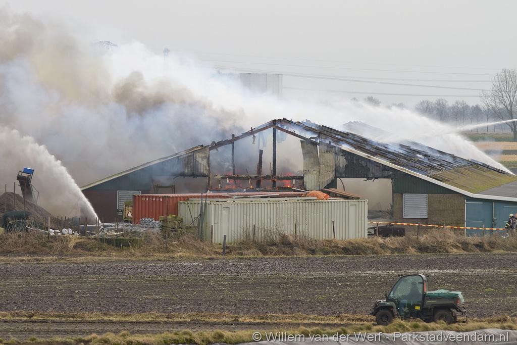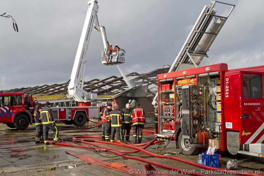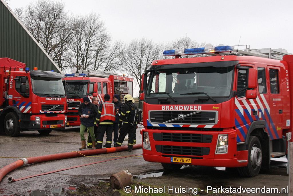 Bij aankomst van het eerste voertuig bleek de voorste loods al compleet vol rook te staan. Met de hoogwerker is geprobeerd een gat in het dak te maken om zo het vuur te kunnen bereiken. Door de forse wind heeft het vuur snel om zich heen kunnen slaan. De loodsen mogen beide als verloren worden beschouwd.