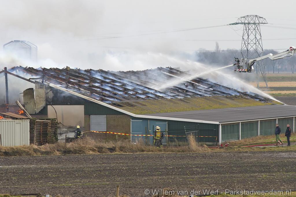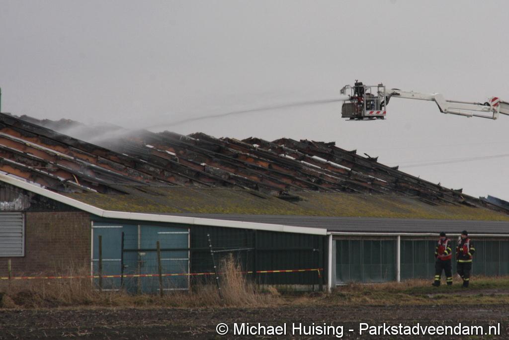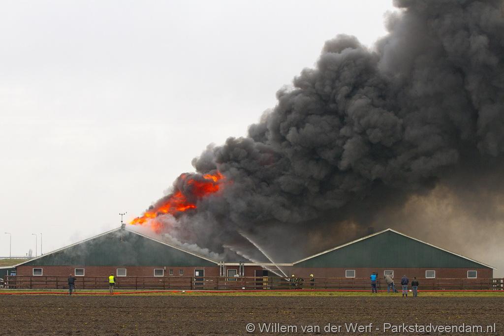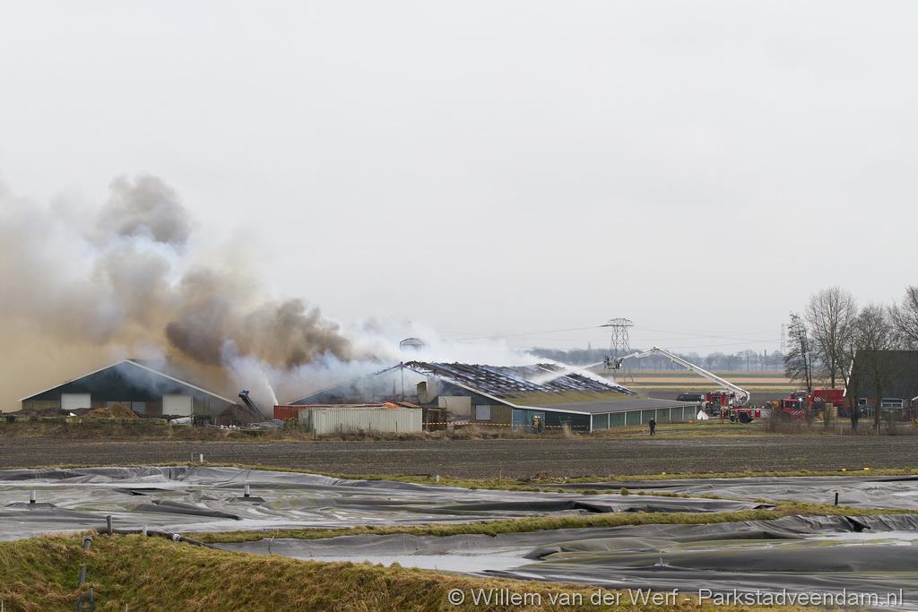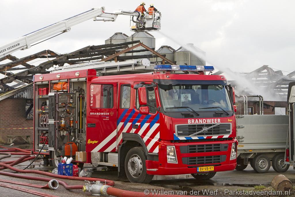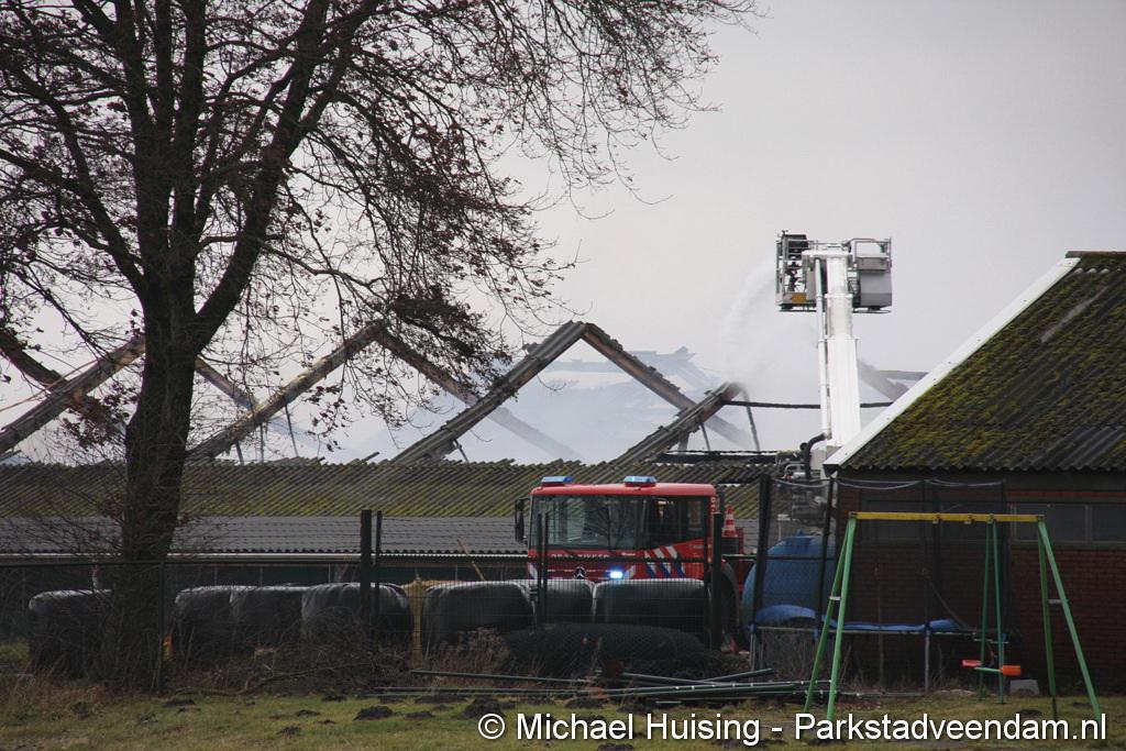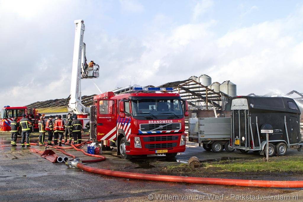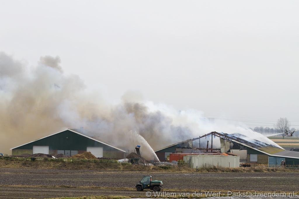 Bij aankomst van het eerste voertuig bleek de voorste loods al compleet vol rook te staan. Met de hoogwerker is geprobeerd een gat in het dak te maken om zo het vuur te kunnen bereiken. Door de forse wind heeft het vuur snel om zich heen kunnen slaan. De loodsen mogen beide als verloren worden beschouwd.