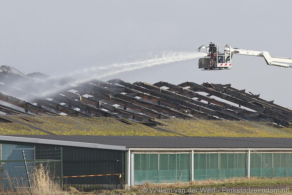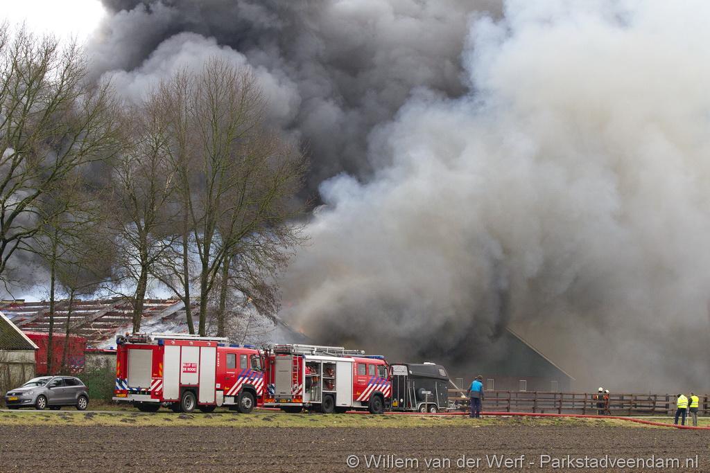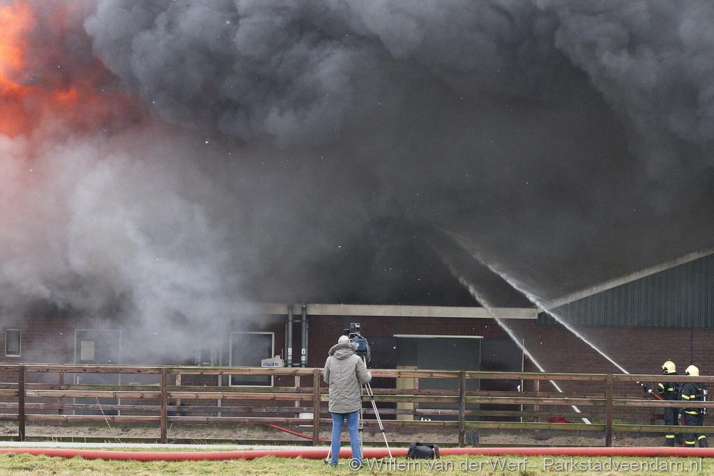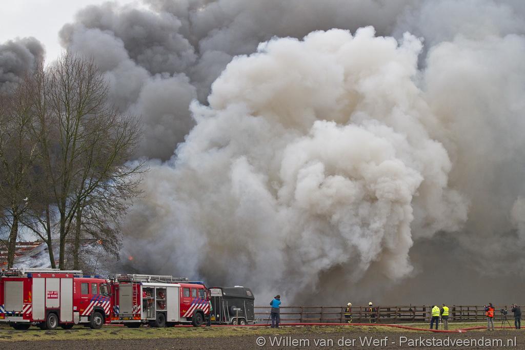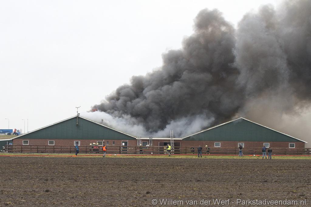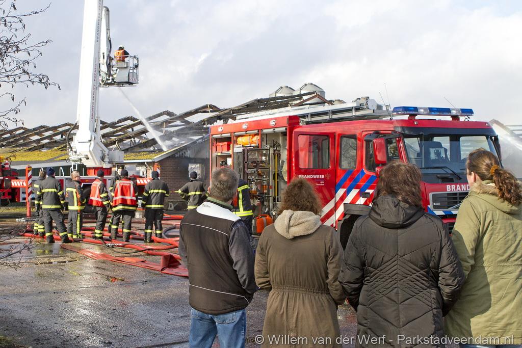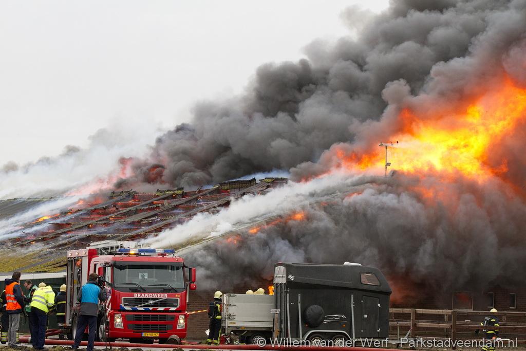 Bij aankomst van het eerste voertuig bleek de voorste loods al compleet vol rook te staan. Met de hoogwerker is geprobeerd een gat in het dak te maken om zo het vuur te kunnen bereiken. Door de forse wind heeft het vuur snel om zich heen kunnen slaan. De loodsen mogen beide als verloren worden beschouwd.