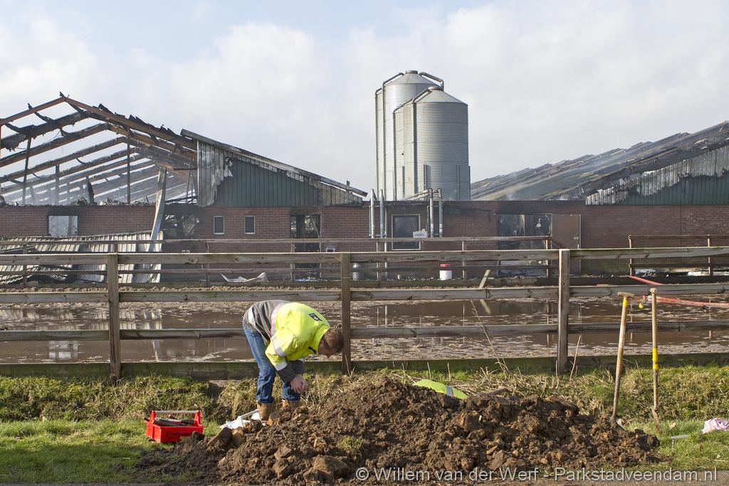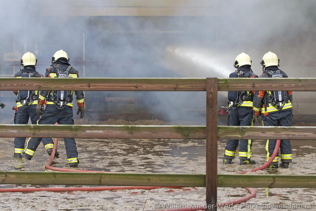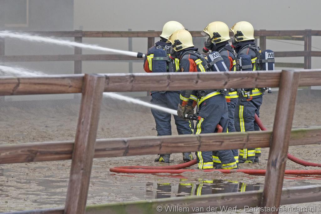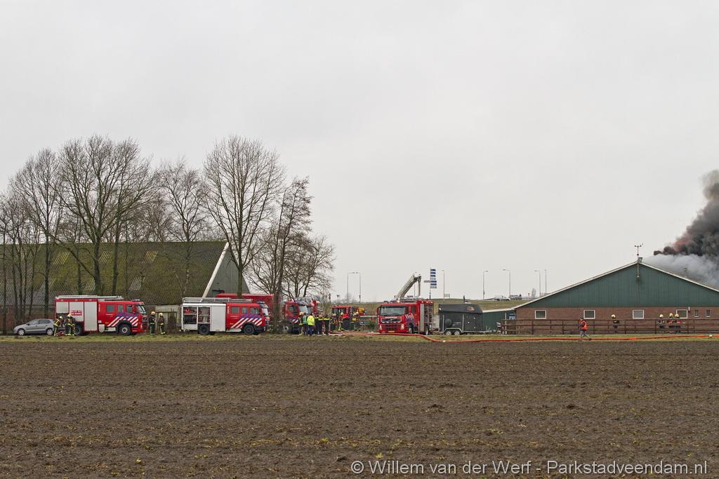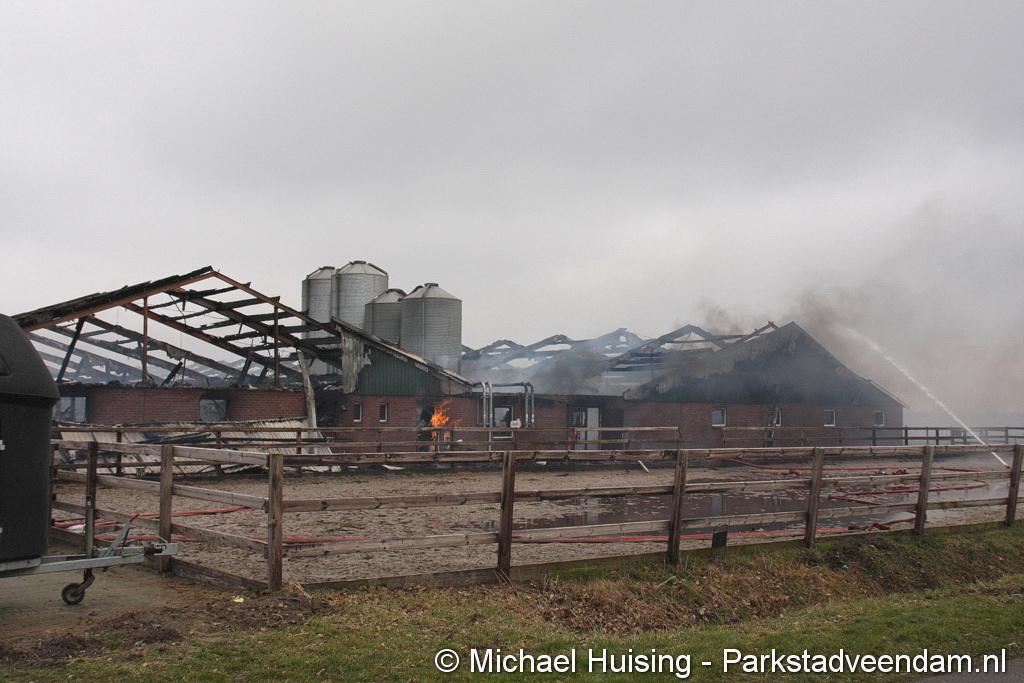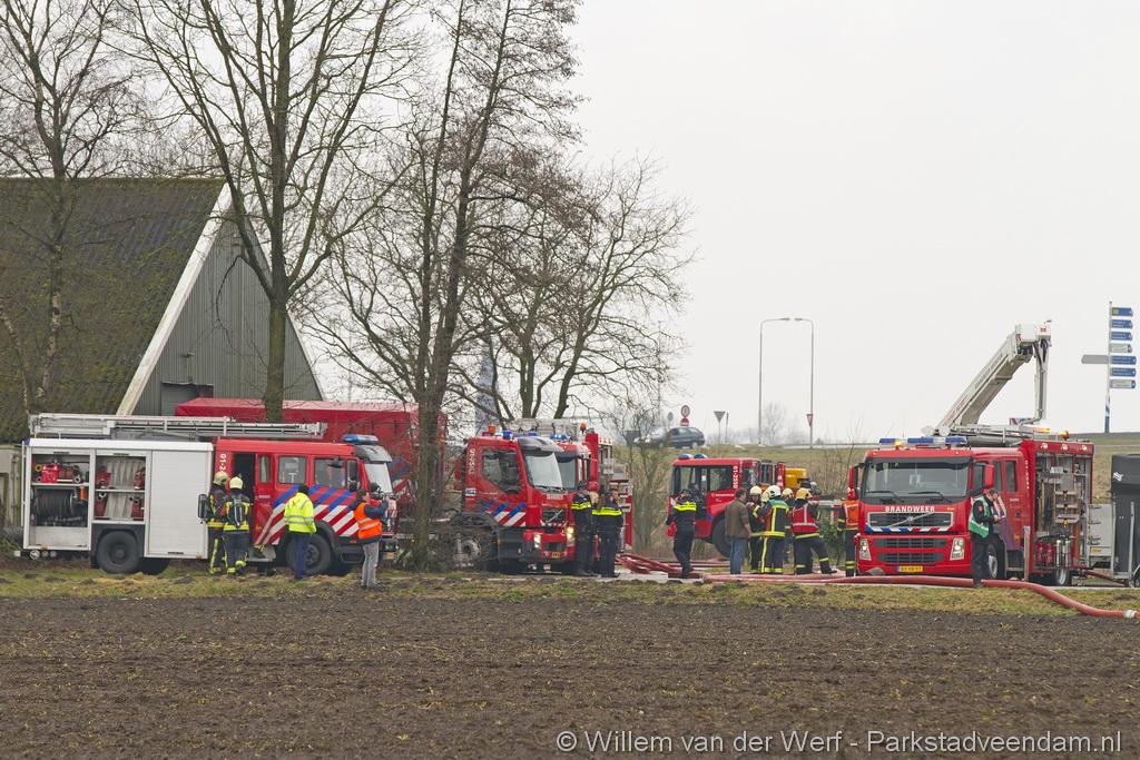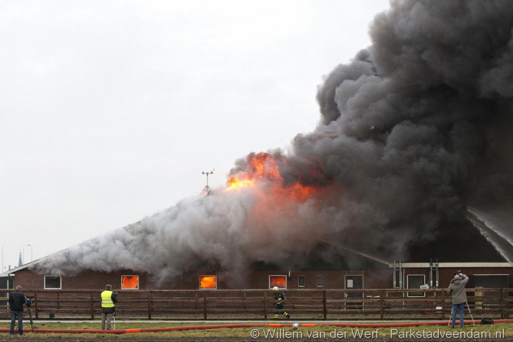Bij aankomst van het eerste voertuig bleek de voorste loods al compleet vol rook te staan. Met de hoogwerker is geprobeerd een gat in het dak te maken om zo het vuur te kunnen bereiken. Door de forse wind heeft het vuur snel om zich heen kunnen slaan. De loodsen mogen beide als verloren worden beschouwd.