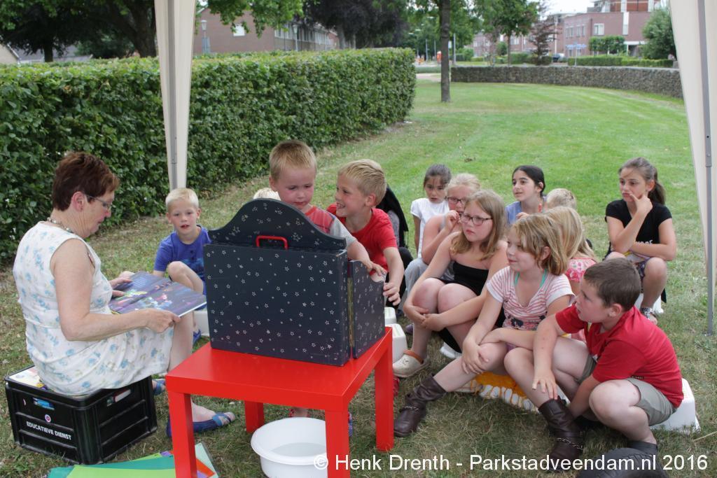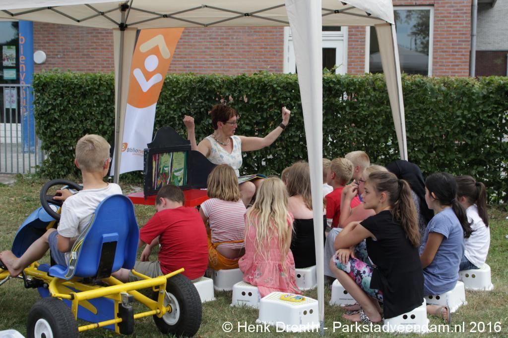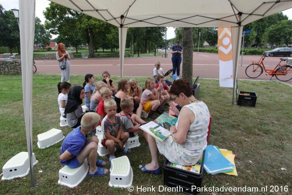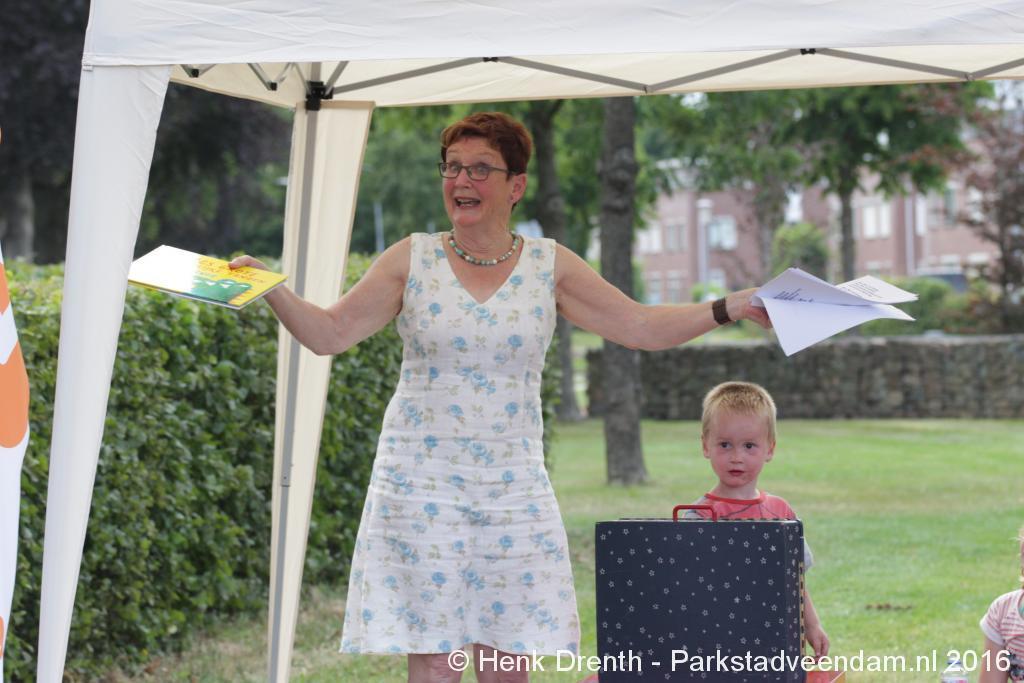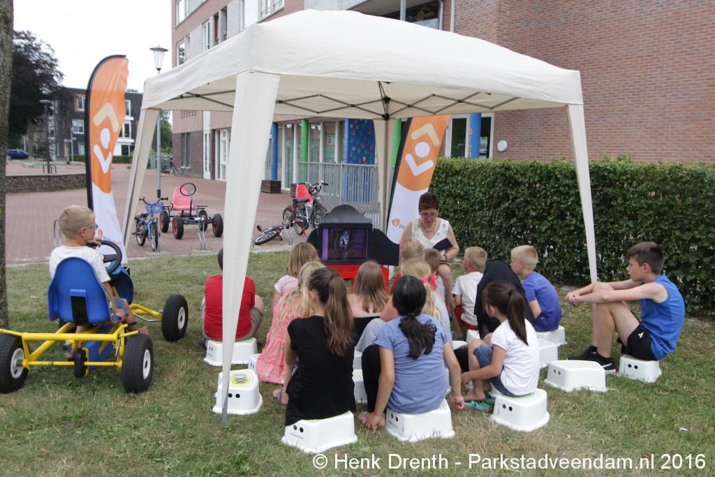 Wil de Jong had haar voorleeskoffer meegenomen. Ze las op heel beeldende wijze voor aan de kinderen, die aan haar lippen gekluisterd zaten. Jolanda roept op om in de zomervakantie in de tent te komen op de woensdagavond van half 7 tot 8 uur. Wil kan super voorlezen en er worden spelletjes gespeeld, zoals lettervissen uit een bak water waarmee woorden kunnen worden gemaakt.
