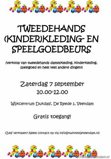 BEURS - Zaterdag 7 september van 10.00-12.00 uur wordt er een tweedehands (kinder)kleding- en speelgoedbeurs georganiseerd in Wijkcentrum Dukdalf in Veendam. U kunt een tafel (6 euro) of een lege plek (4 euro) reserveren om zelf uw (gebruikte)kinder- en dameskleding en/of speelgoed te verkopen. Uiteraard is de opbrengst helemaal voor uzelf. Tevens bieden wij mogelijkheid om speelgoed in te brengen. Neem voor meer informatie over het reserveren van een tafel of over inbrengen van speelgoed contact op via info@twinkeltjeveendam.nl.