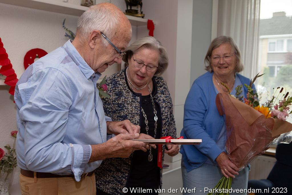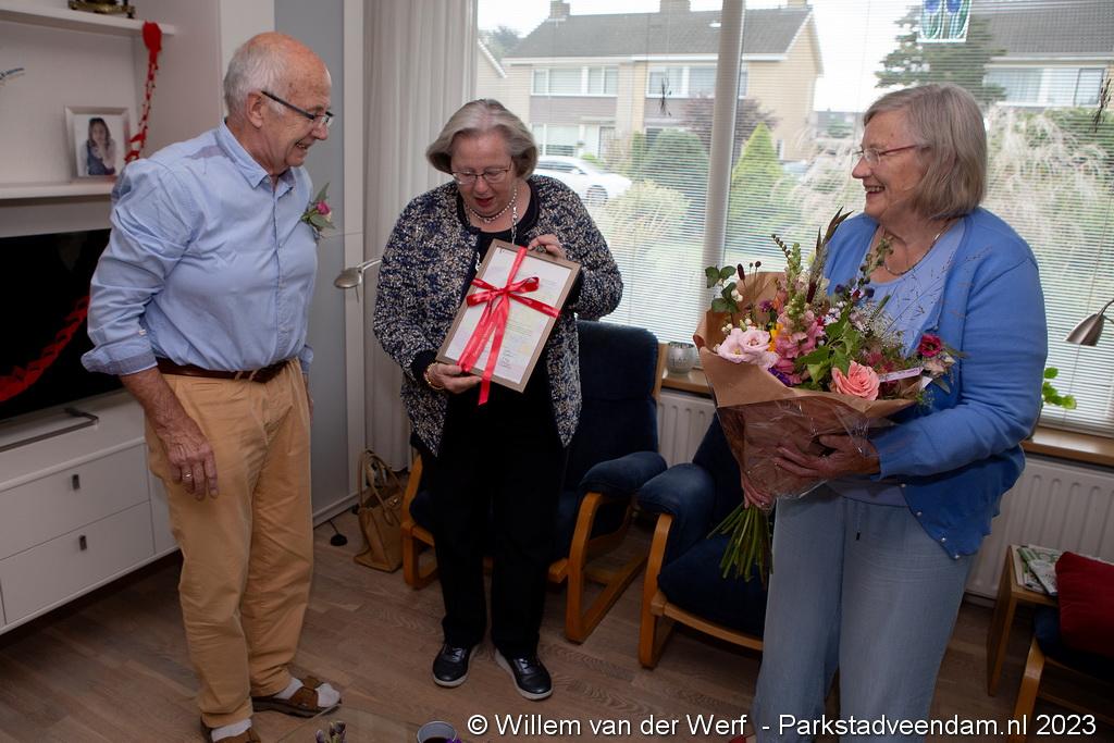 Burgemeester Sandra Korthuis ging bij het echtpaar op de koffie en feliciteerde het echtpaar namens de gemeente Veendam op hun huisadres met een fraai boeket bloemen en de trouwakte van 60 jaar geleden
