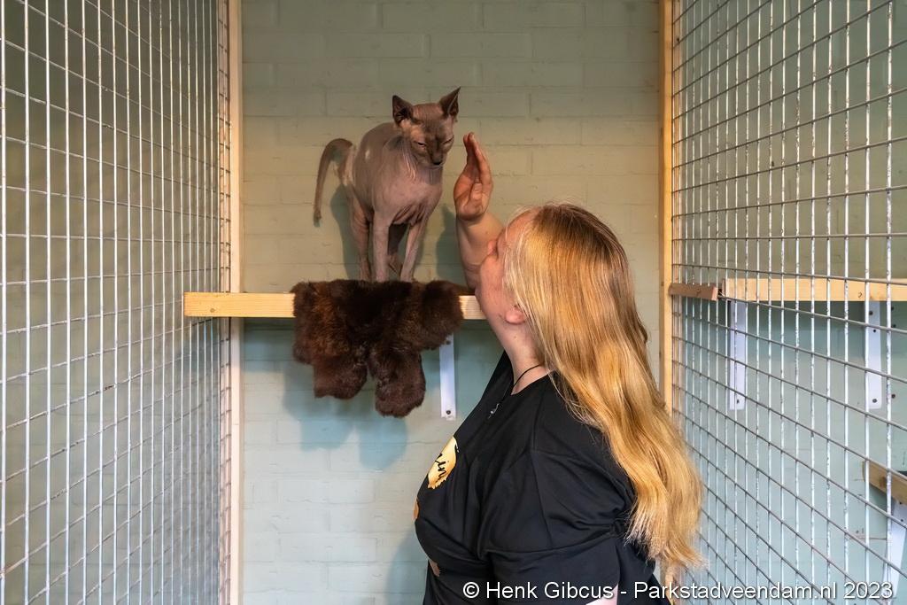 In het hotel hebben de katten ieder een eigen ruimte met krabpaal waar ze zich lekker rustig kunnen terugtrekken. “Katten slapen ca. 22 uur per dag,” vertelt Cindy, “dus is het belangrijk dat ze die rust ook krijgen.” Indien gewenst kunnen de katten naar een gezamenlijke speelruimte, maar ’s avonds en ’s nachts moeten ze in hun eigen ruimte verblijven. “Ik houd de dieren goed in de gaten. Natuurlijk gedrag is dat katten graag wat hoger liggen om alles in de gaten te houden. Ook kijk ik of ze voldoende drinken en eten. Stress is voor katten écht ziekmakend, dus dat moet zoveel mogelijk vermeden worden. Het belang van de kat staat bij ons altijd voorop.”