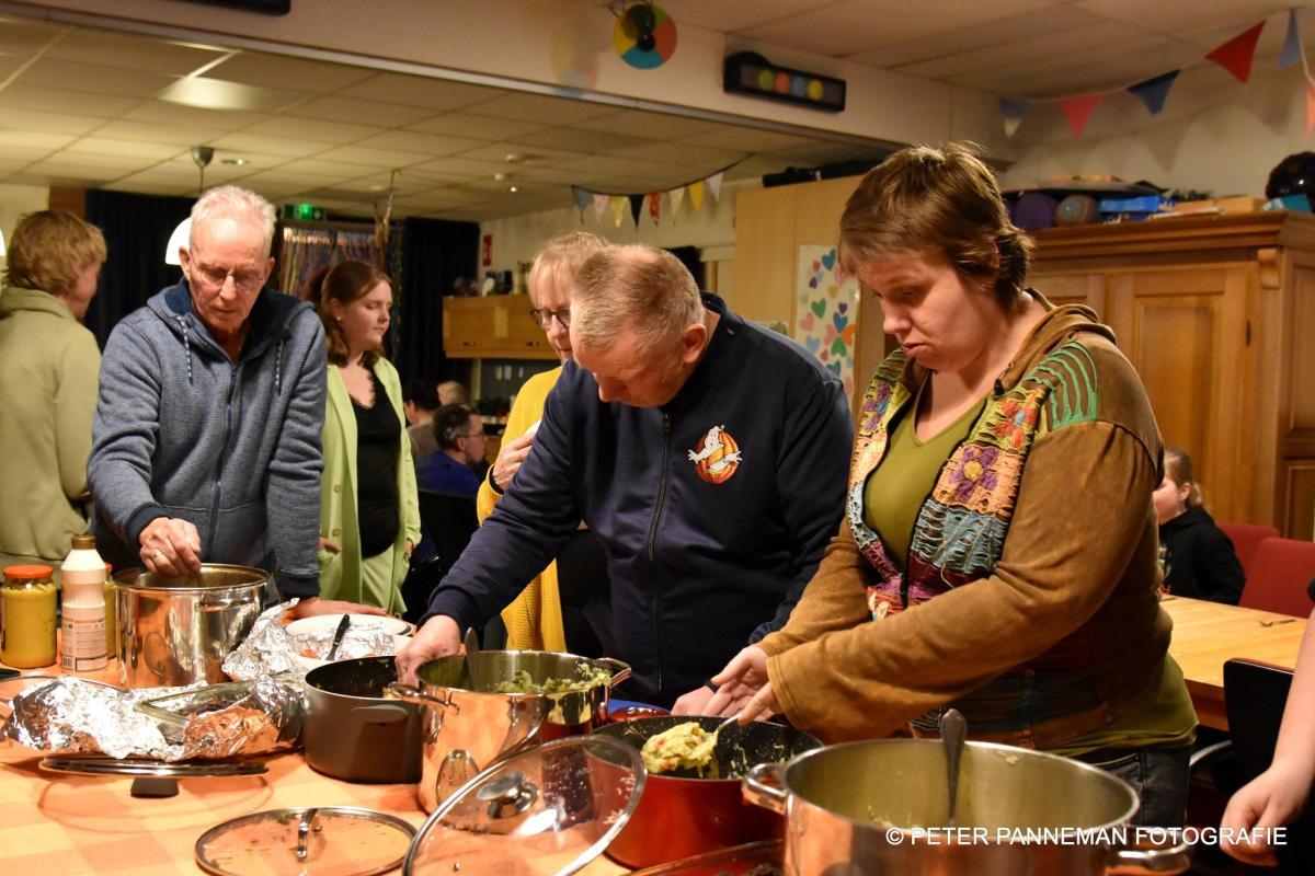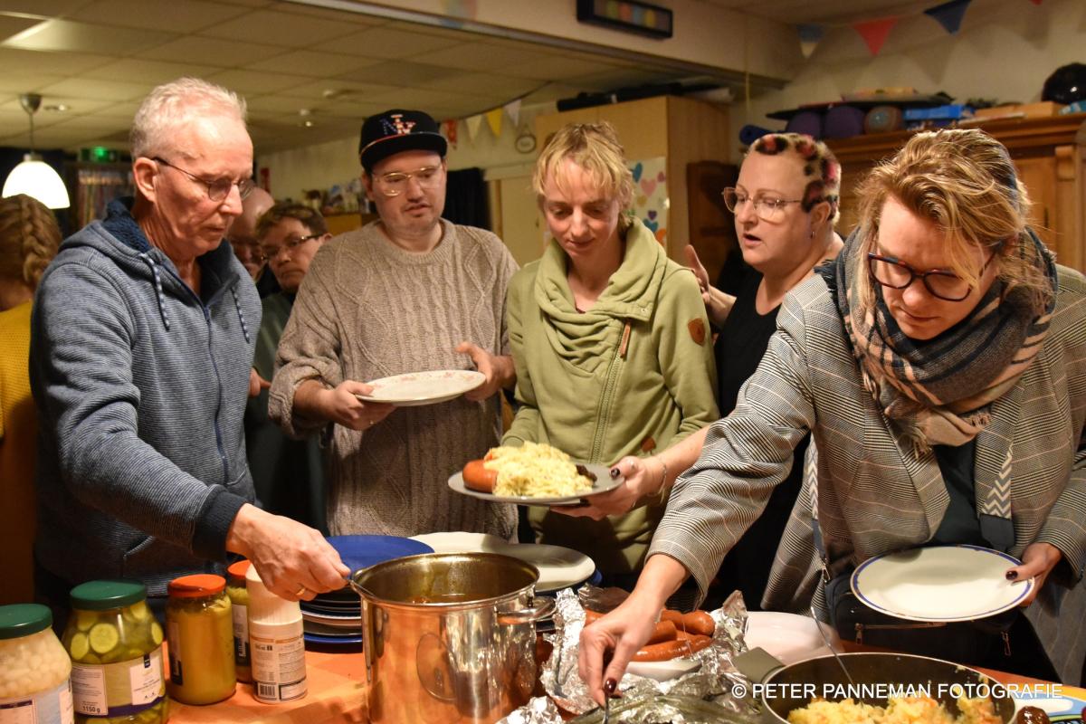 Een bijzonder moment aan het begin van de vrijdagavond bij Stichting VoorDoor in Wildervank. Gea Schoonewille en Sita van der Veen boden namens de SP Veendam de circa 27 aanwezigen een stamppotbuffet aan, als dank voor het waardevolle werk dat Stichting VoorDoor verricht voor de inwoners van Veendam, Wildervank en omstreken.
