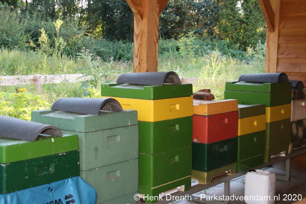 Op het volkstuincomplex van Tuinvereniging Tuinrecreatie Veendam heeft imker Bennie van Buizen acht bijenkasten staan met maximaal 480.000 honingbijen. Met per kast een bijenvolk van zo’n 40- tot 60 duizend met een koningin.