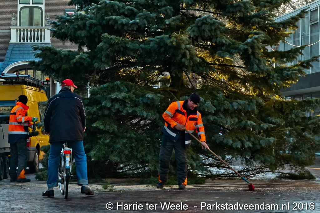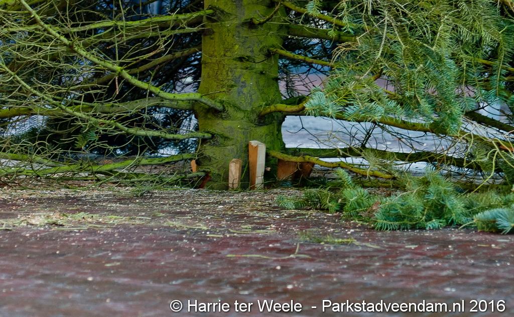 Een 12 meter hoge kerstboom afkomstig uit Muntendam is dinsdagmorgen op het Raadhuisplein geplaatst. De Ondernemers Vereniging Centrum (OVC) voorzien de boom van verlichting.