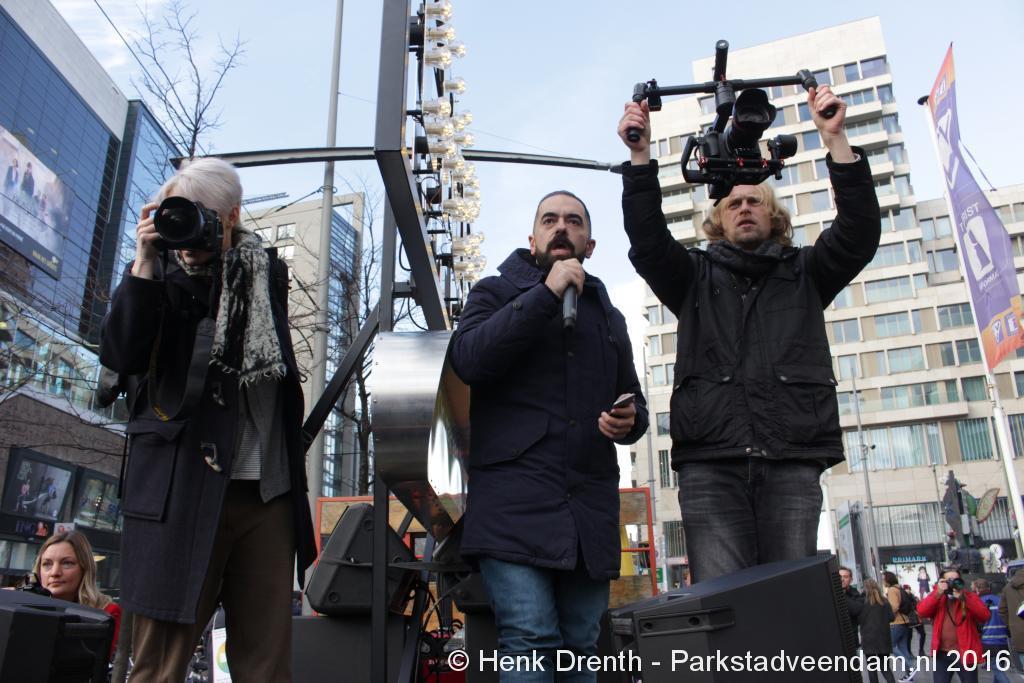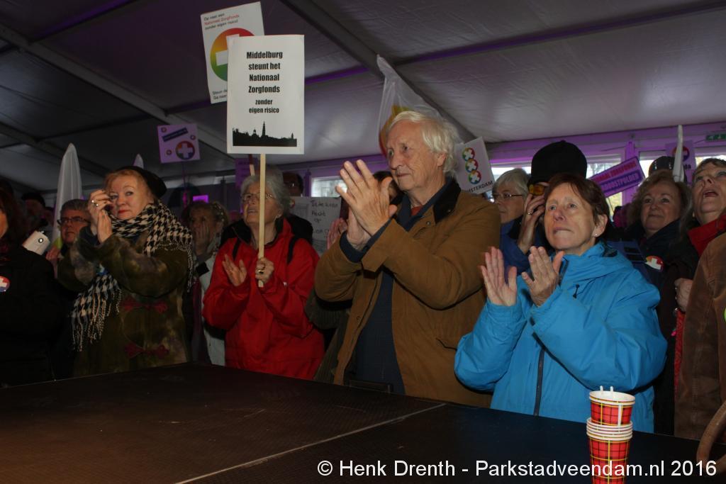 Actievoerders die al lang met de 100 dagentour bezig waren werden op het podium geroepen en bedankt voor hun inzet. FNV Zorg en Welzijn en Senioren en Omroep Max steunen de actie. Henk Krol van de partij 50 Plus en Emile Roemer van de SP hebben de deelnemers toegesproken. Econoom Ewald Engelen hekelde de marktwerking in de zorg. “Het zou de zorg goedkoper maken en de wachtlijsten oplossen. Tien jaar na de invoering moeten we constateren dat dit compleet mislukt is”, hield hij de toehoorders voor. “Over ruim honderd dagen zijn de verkiezingen. Dan kan Nederland zich uitspreken over het beleid van het kabinet Rutte in het algemeen en het Nationaal ZorgFonds in het bijzonder”.