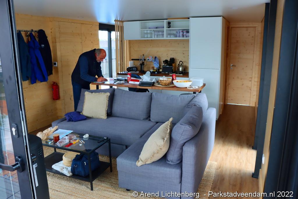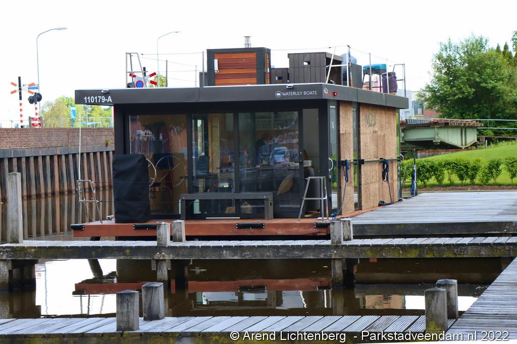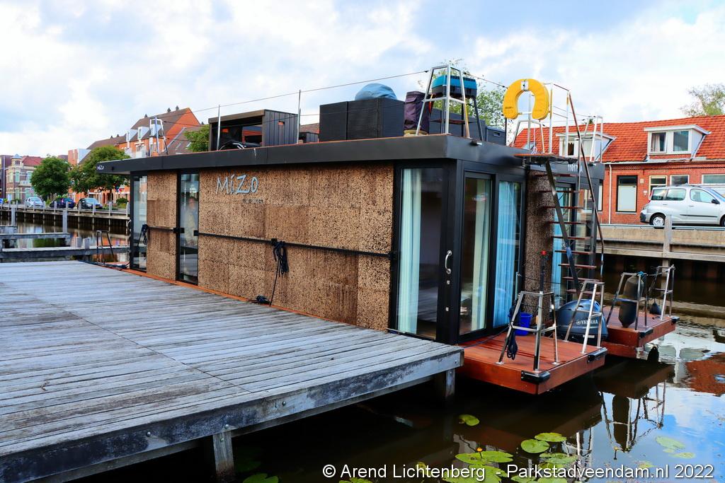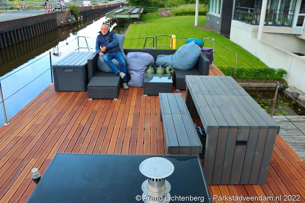 Op het platte dak van deze woonark zonder vaste ligplaats is het genieten en is zelfs voorzien van zonnepanelen. De eigenaren komen uit Duitsland en varen via de provincies Friesland en Groningen vrijdag weer terug naar Duitsland.