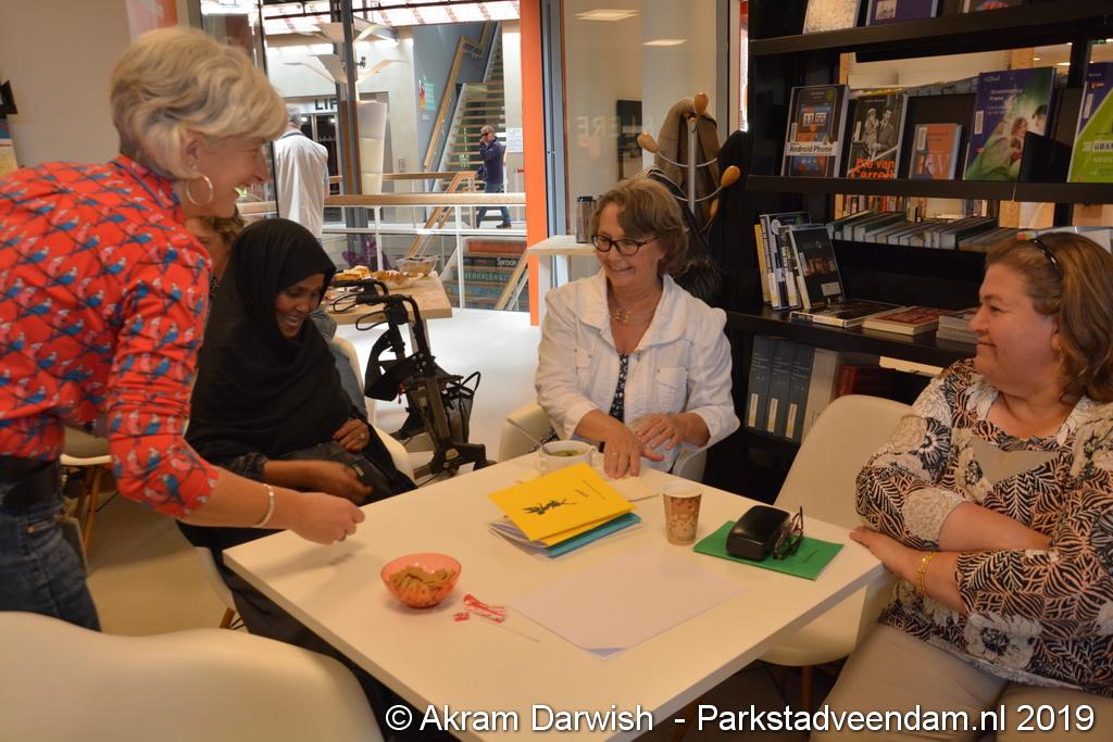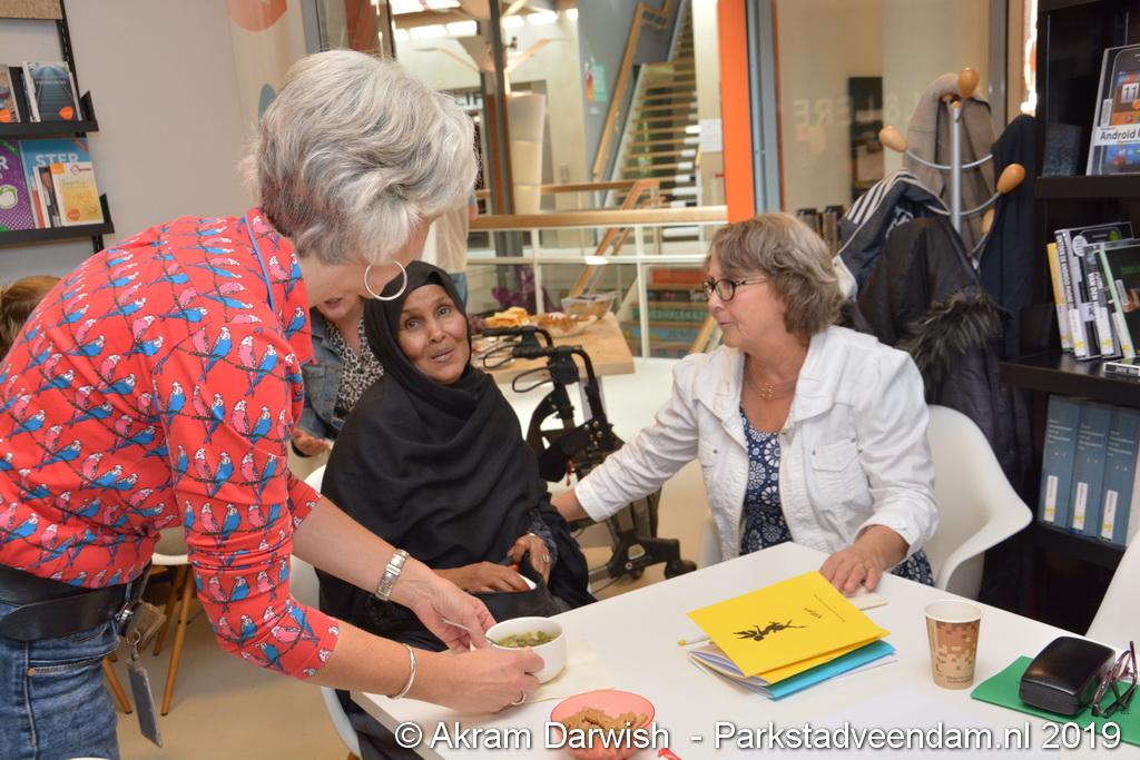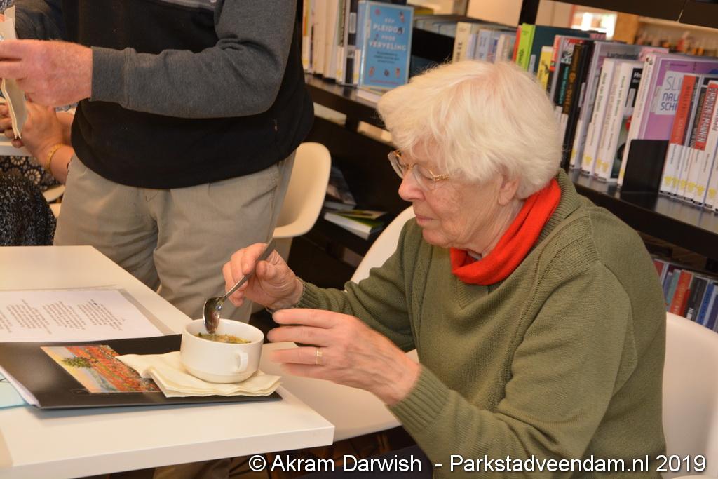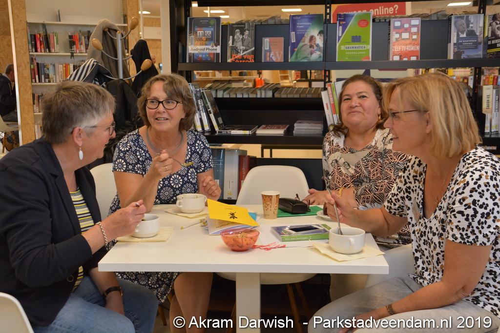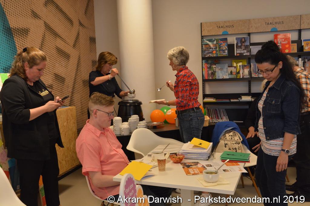 De vrijwilligers van het Taalhuis hadden diverse lekkere hapjes gemaakt als cadeautje voor de gemeente Veendam. Het was in een heel informele sfeer en er werden contacten gelegd. Wethouder Annelies Kleve schepte de soep op en schoof zelf ook aan.