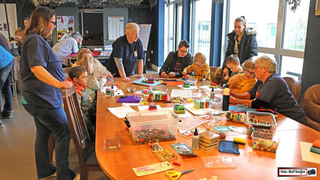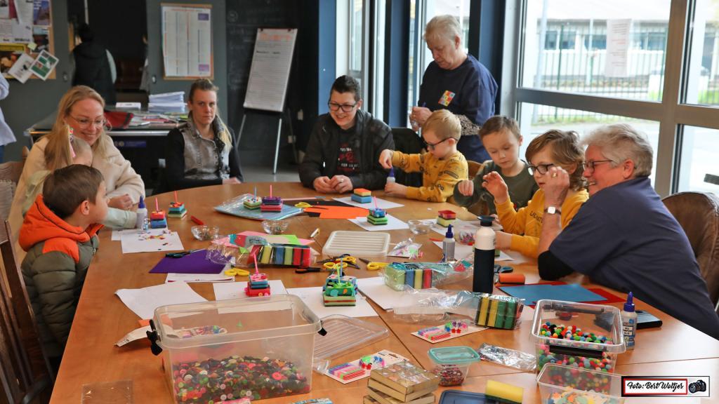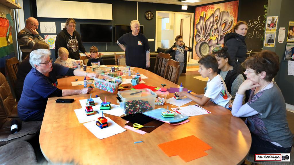 Bij de knutseltafel waar sponstaartjes gemaakt konden worden liep het storm. Van grote en kleine schuursponsjes en allerlei ander klein knutselmateriaal om de sponsjes mee te versieren werden allemaal lekkere gebakjes gemaakt. Natuurlijk bovenop de taartjes een verjaardagskaarsje. Het water liep menigeen dan ook in de mond.