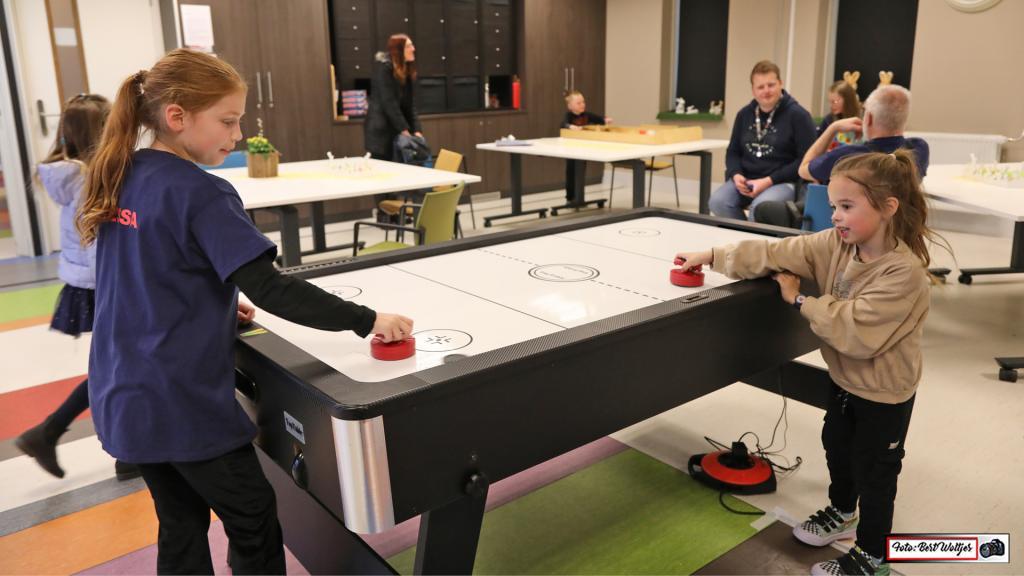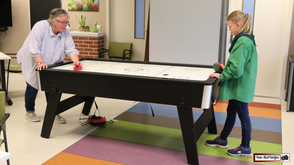 Het spellenparcour is ook altijd erg in trek. Naast hoedje wip en rechtop sjoelen stond dit keer ook de air-hockeytafel opgesteld. Een groot succes bij jong en oud.